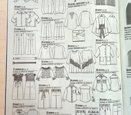 Для моделей, в зависимости от рубрики, предлагаются выкройки размеров – с 38-го по 54-й (размеры IT). Также есть специальный раздел с актуальной модой для детей. Все модели сопровождаются выкройками и подробными инструкциями по шитью.