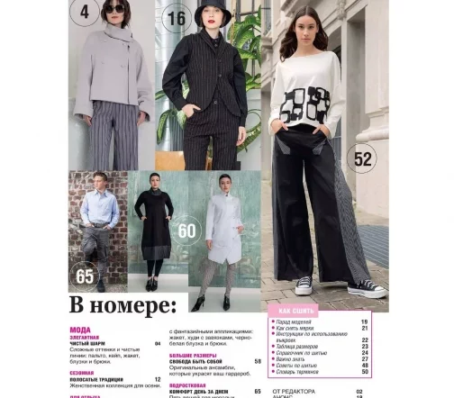 В номере представлены: Накидка в винтажном стиле. Брюки-палаццо и укороченный жилет. Пальто: однотонные и в мелкую полоску. Трикотажные модели с фантазийными аппликациями. Брюки: 9 моделей, который подойдут всем. Большие размеры: платье длиной миди, топ, худи и юбка с силуэтом амфоры. Мода для подростков (13-16 лет): комфортные модели на каждый день.