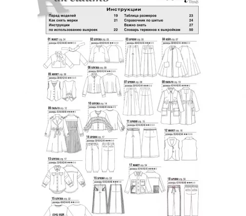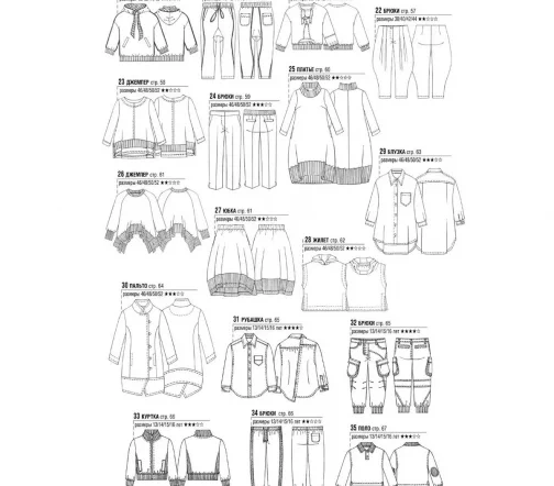 Для моделей, в зависимости от рубрики, предлагаются выкройки размеров – с 38-го по 54-й (размеры IT). Также есть специальный раздел с актуальной модой для детей. Все модели сопровождаются выкройками и подробными инструкциями по шитью.