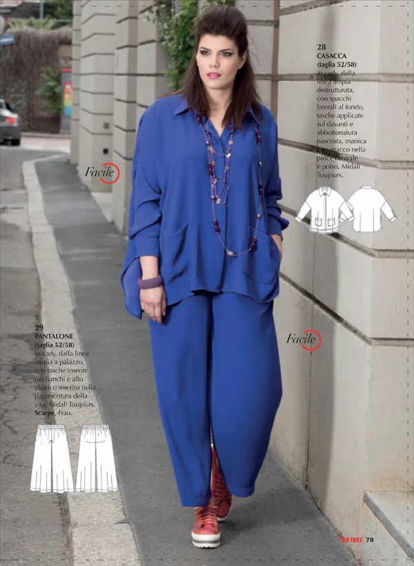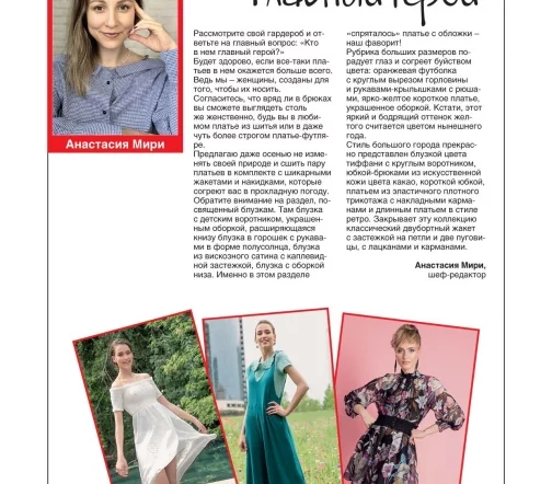 Предлагаем сшить пару платьев в комплекте с шикарными жакетами и накидками. Обратите внимание на раздел посвященный блузкам. Рубрика больших размеров порадует глаз и согреет буйством цвета. Стиль большого города прекрасно представлен блузкой цвета тиффани, юбкой-брюками из искуственной кожи, короткой юбкой, платьем из эластичного плотного трикотажа с накладыми карманами и длинным платьем в стиле ретро. Закрывает коллекцию классческий двубортный жакет с застежкой на петли и две пуговицы с лацканами и карманами.
