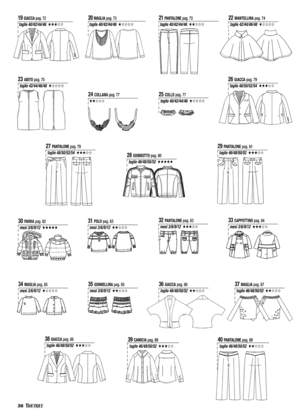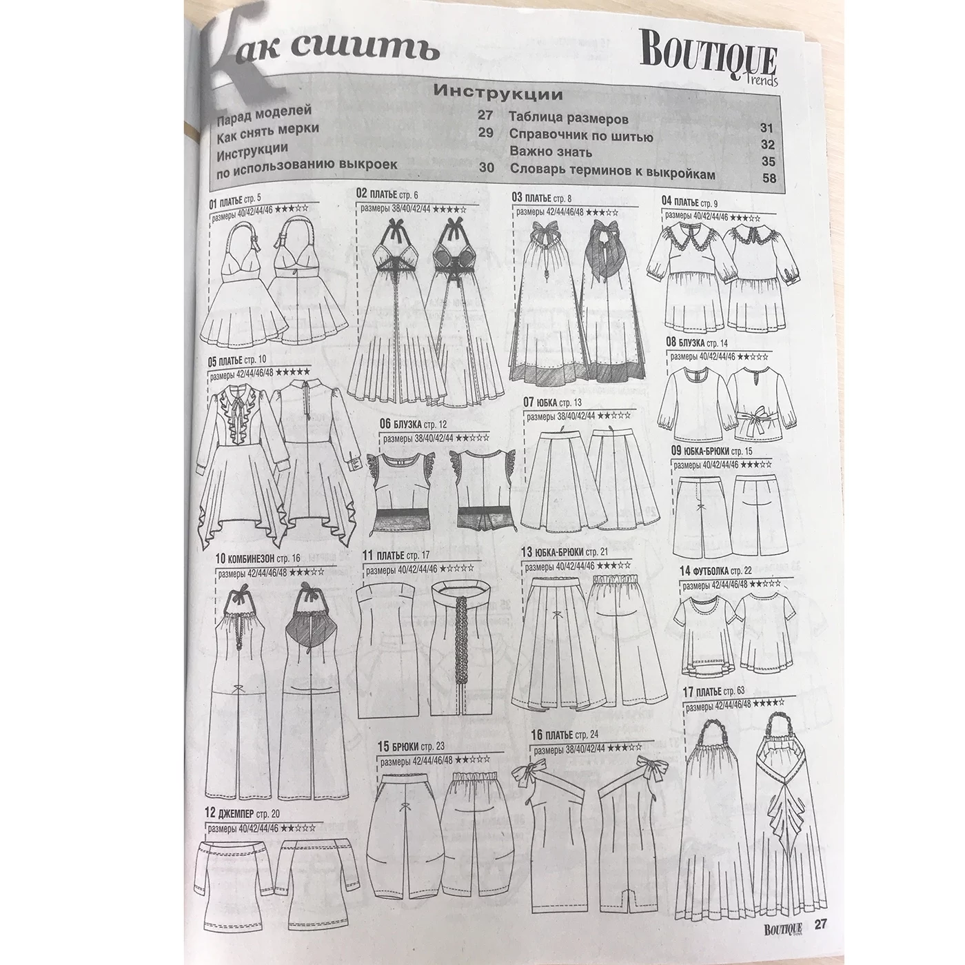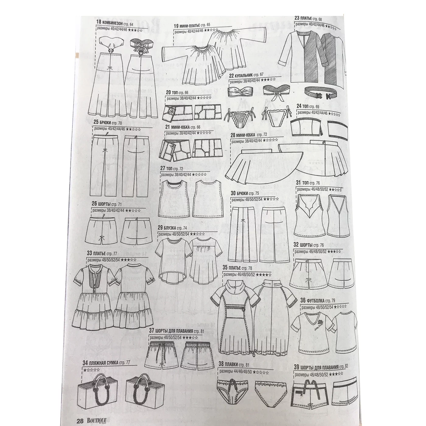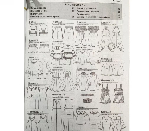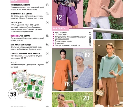 Для моделей, в зависимости от рубрики, предлагаются выкройки размеров – с 38-го по 54-й (размеры IT). Также есть специальный раздел с актуальной модой для детей. Все модели соп