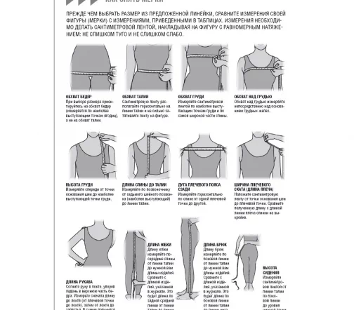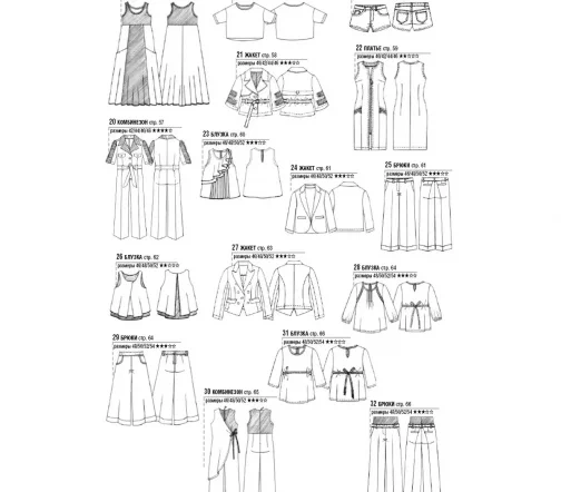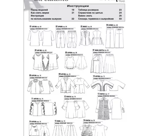 Для моделей, в зависимости от рубрики, предлагаются выкройки размеров – с 38-го по 54-й (размеры IT). Также есть специальный раздел с актуальной модой для детей. Все модели сопровождаются выкройками и подробными инструкциями по шитью.