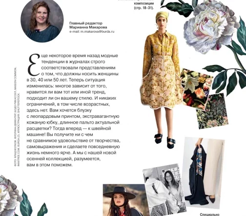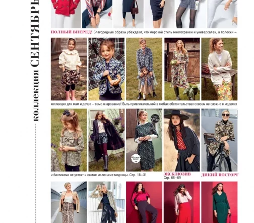 Роскошные трендовые флоральные узоры в коллекции для мамы и дочки. Дизайнерская парка. Новые образы в морском стиле и эффектный стрит-шик с «хищными» принтами. Яркие модели размера plus. Морская тема выглядит благородно как никогда. Чудесные принты и милые детали для мамы с дочкой. Мастер-классы: элегантная блузка с бантом и защипами на рукавах. Трикотажное платье, окантованное бейкой. Эксклюзив: идеально для осени: парка от немецкого бренда MAISON COMMON. Возвращение анималистических мотивов. Мода plus: леди в красном и не только: безупречное сочетание цвета и кроя. Размеры 44–52.