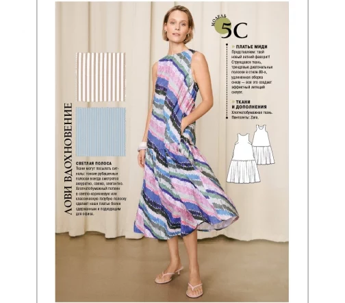 Просто прелесть! Выглядит восхитительно и легко шьется: свободное платье с пестрыми полосками и длинной сборкой.