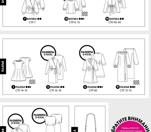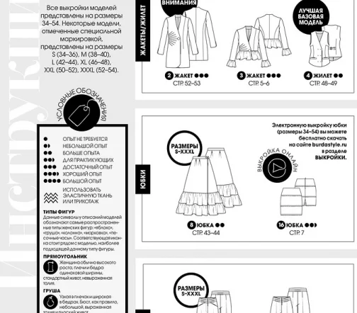 Все выкройки моделей в журнале представлены на размеры 34−54.