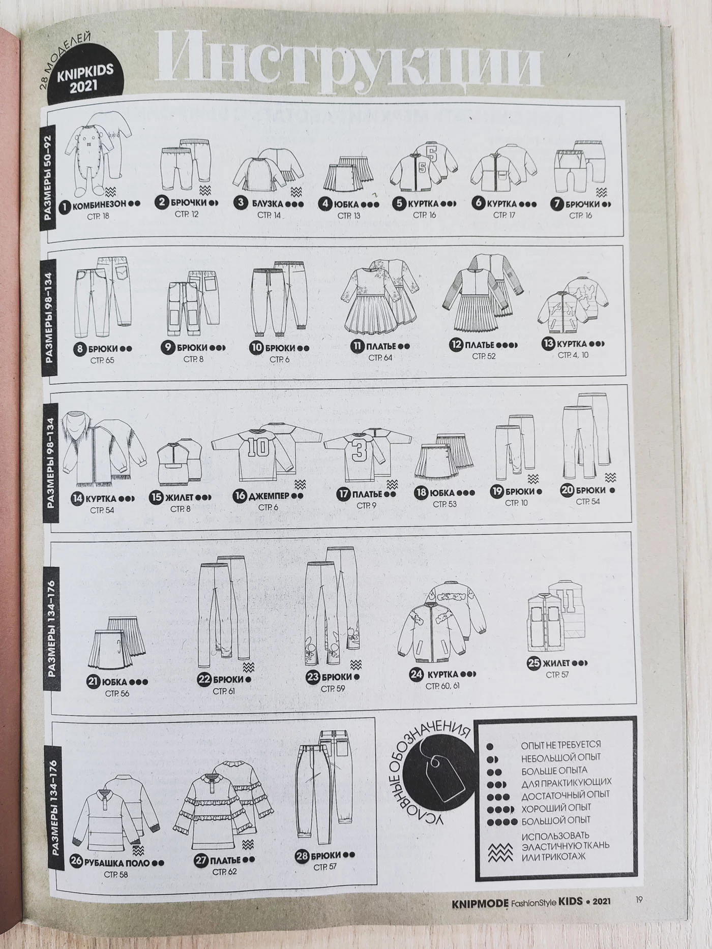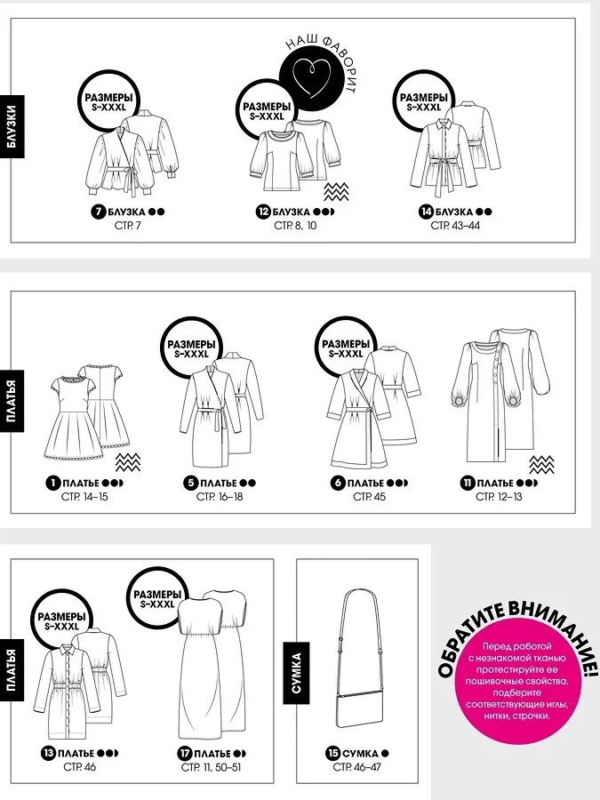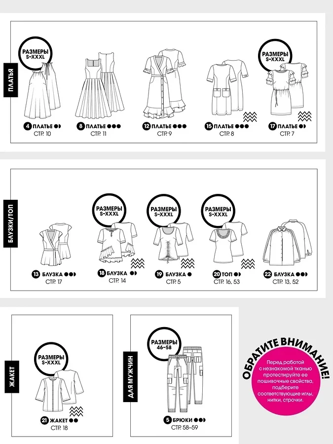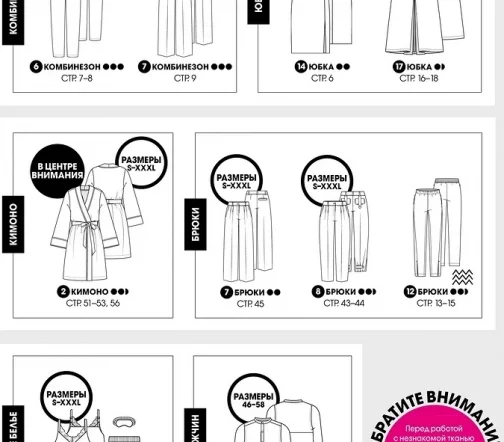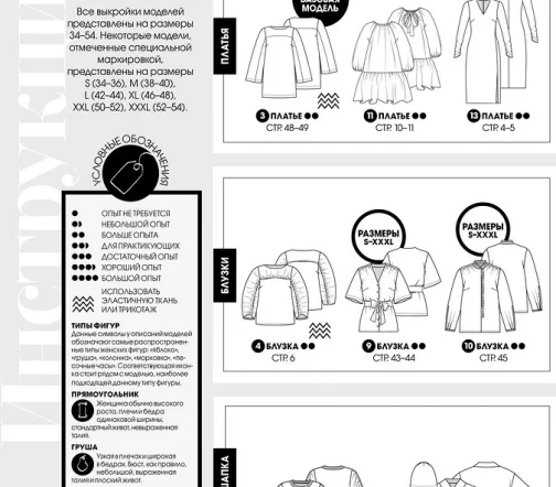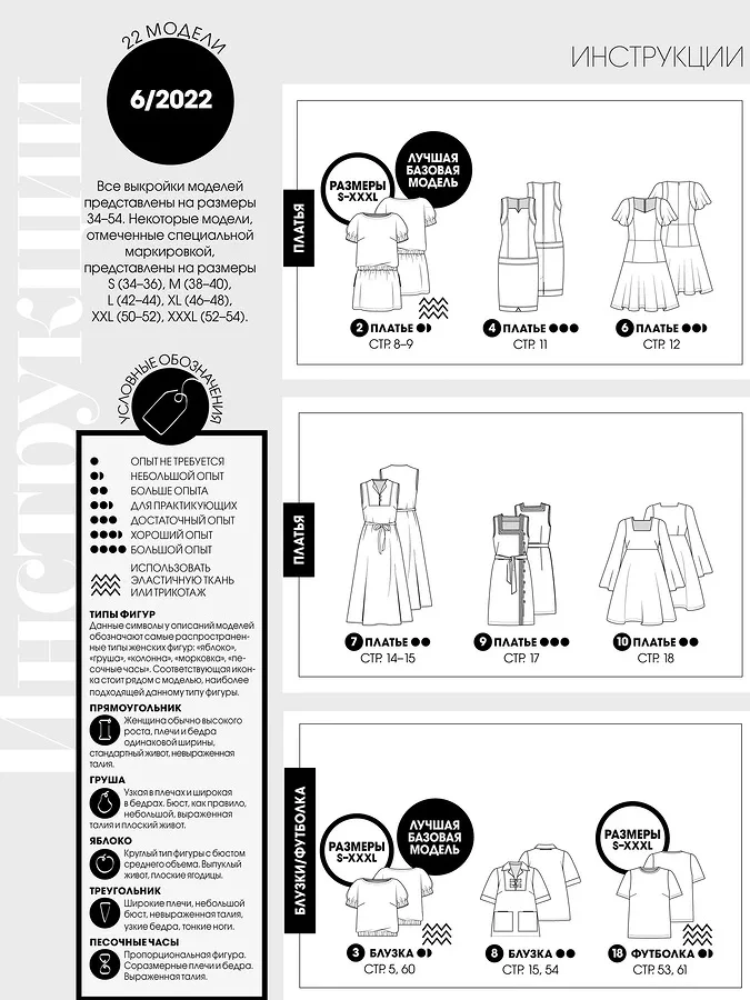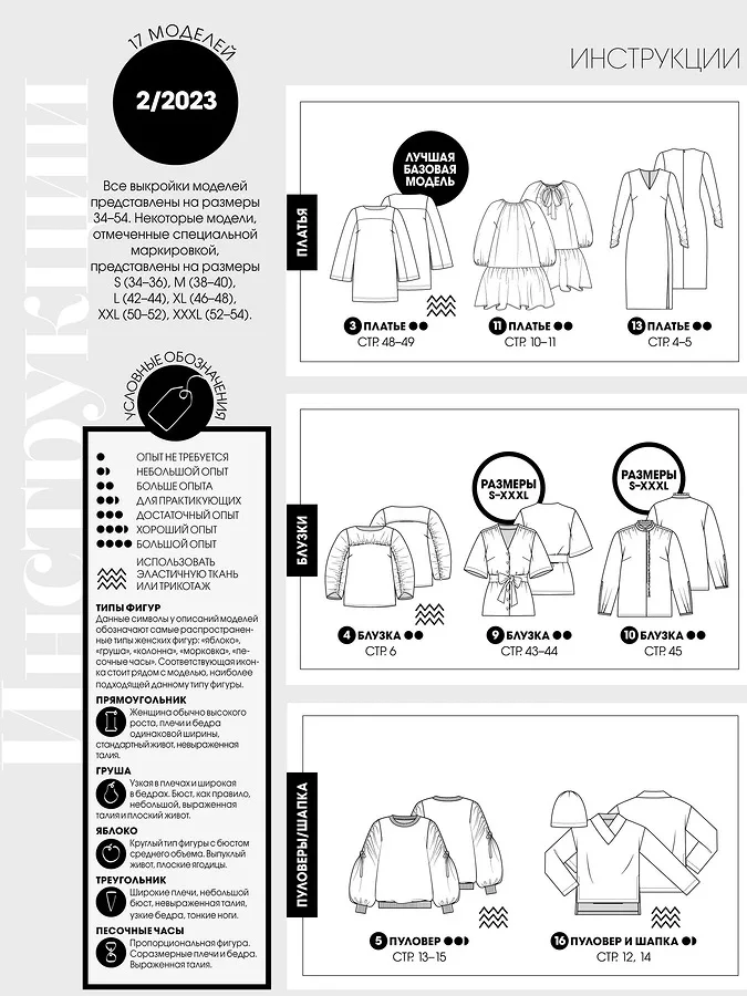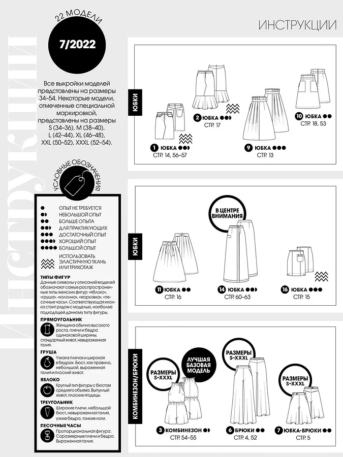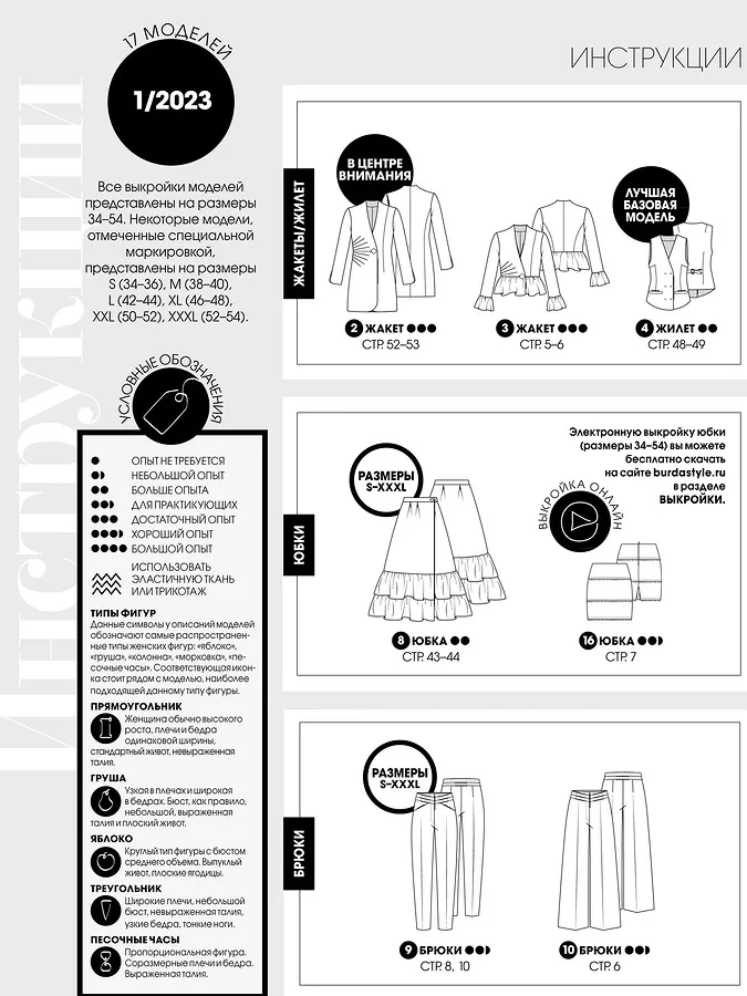 Все выкройки моделей в журнале представлены на размеры 34−54.
