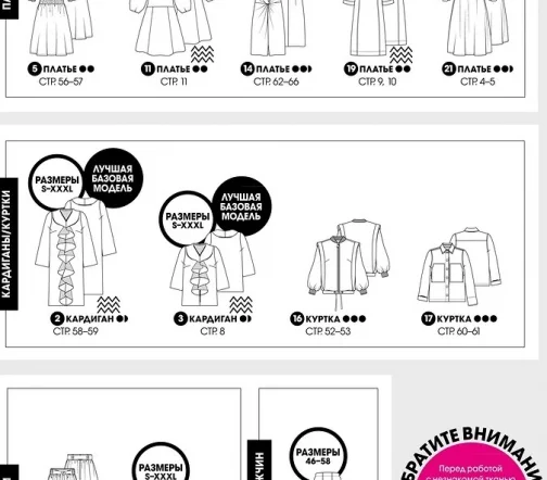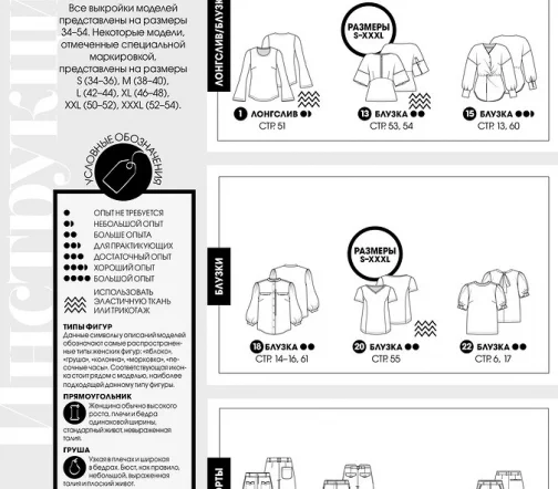Все выкройки моделей в журнале представлены на размеры 34−54.