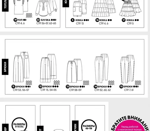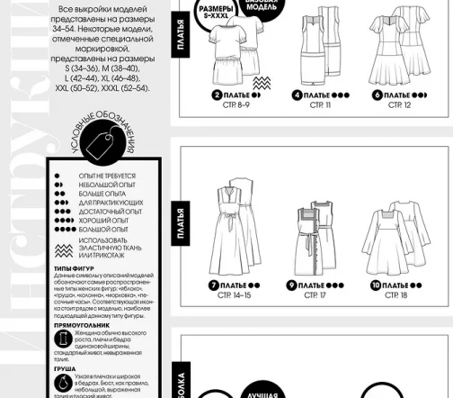 Все выкройки моделей в журнале представлены на размеры 34−54.