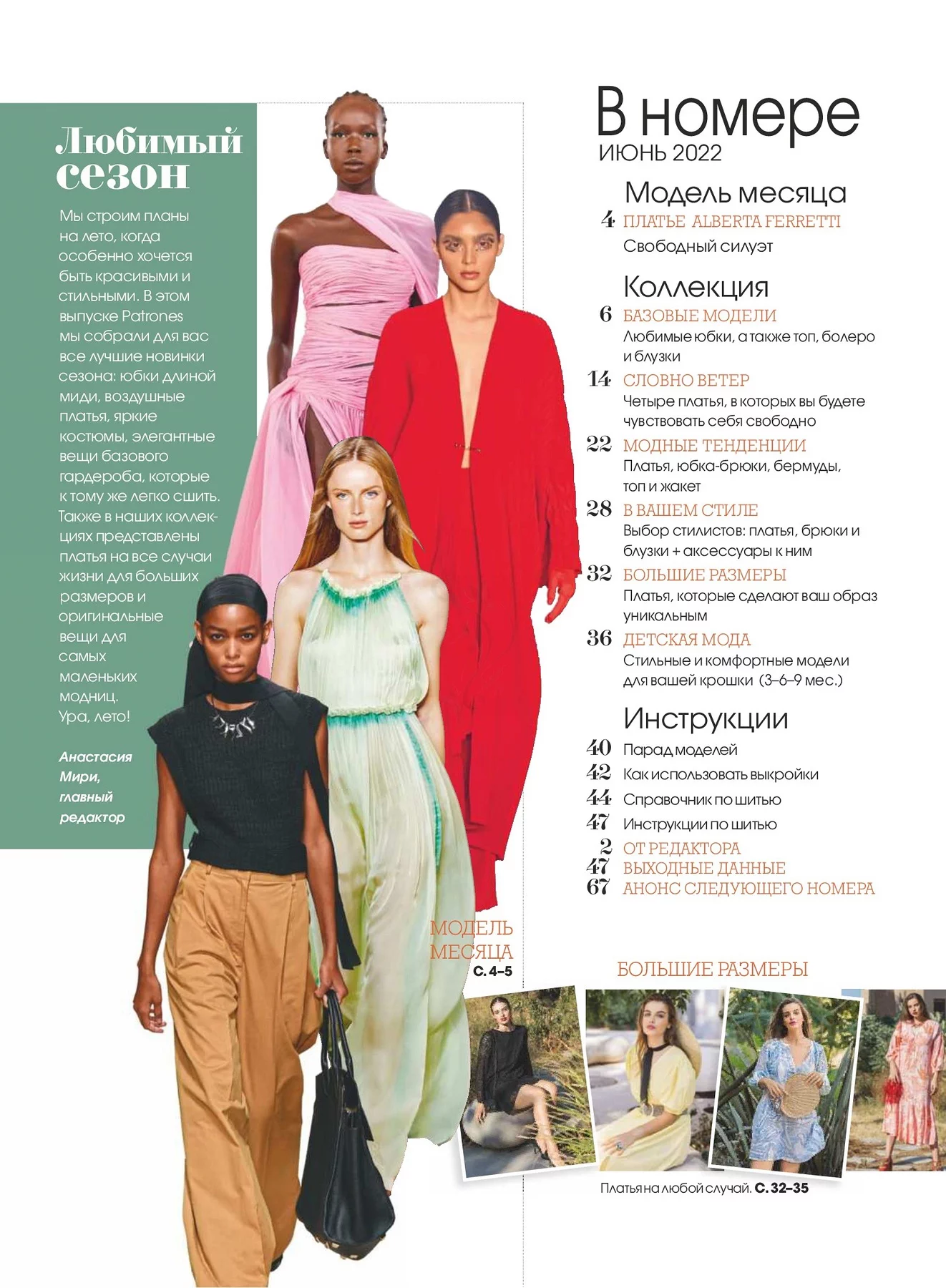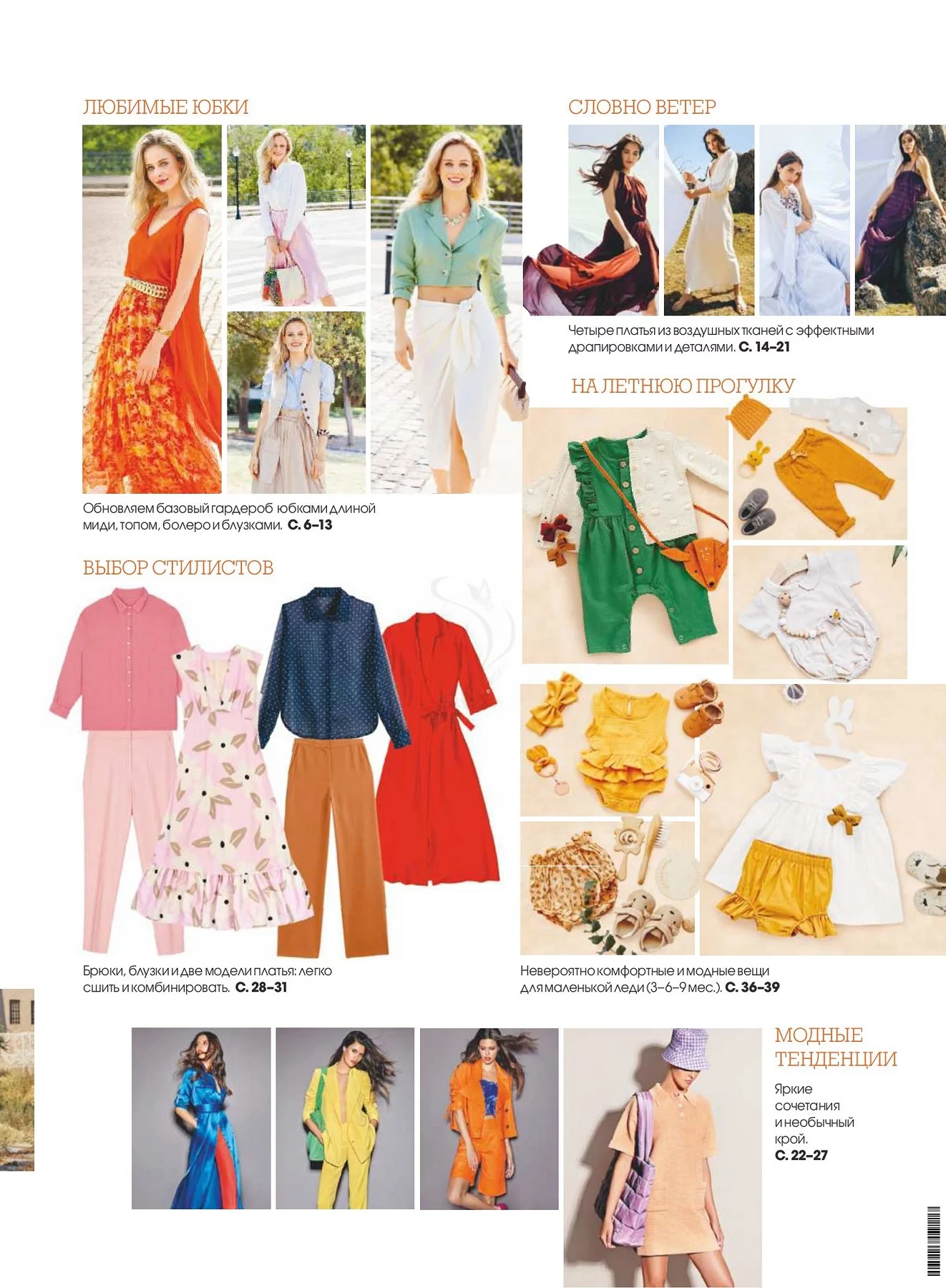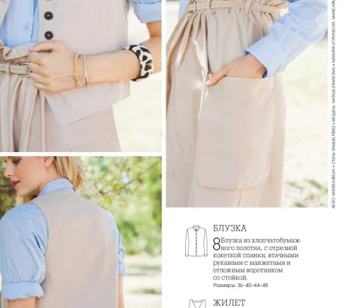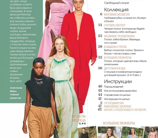 В каждом номере – около 40 женских моделей широкого размерного ряда, предназначенные для работы, праздничных выходов, отдыха и путешествий, а также модели для детей. Журнал содержит подробные инструкции по шитью и выкройки, обеспечивающие отличную посадку на фигуру.
