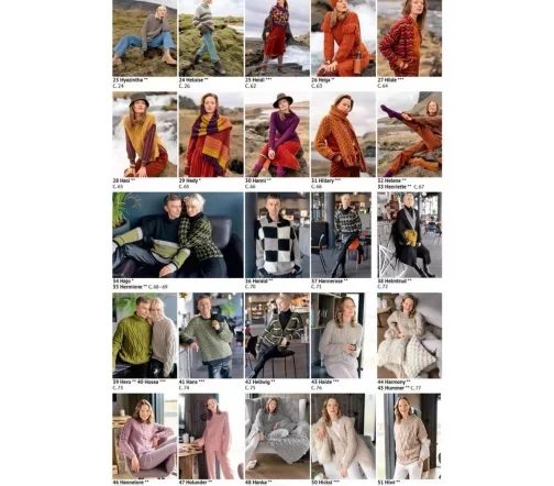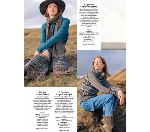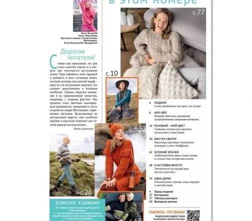 В номере. 51 эксклюзивная модель Размеры 34-52 (европейские размеры) ФЭР-АЙЛ: традиционный жаккард с шотландскими мотивами в новом свете. РОЗОВЫЙ: тон задают сияющие оттенки, от фуксии до пурпурного. МИСТЕР СВИТЕР: идеальный выбор для холодного времени года - спортивный пуловер в стиле «бойфренд». В КРАСКАХ ОСЕНИ: теплые тона тыквы, кукурузы и баклажана для уютного трикотажа. ИДЕАЛЬНАЯ ПАРА: элегантное сочетание черного и белого с зелеными вкраплениями нравится и женщинам, и мужчинам. ОДНА ДОМА: вечная классика в мягкой гамме, подкупающая изысканным дизайном без излишеств.