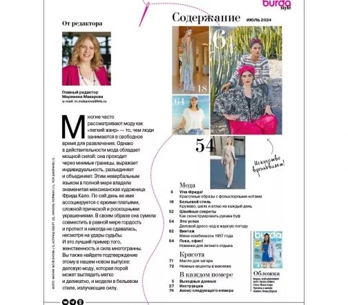 Burda Style (Бурда Стайл) - это европейская мода высокого класса. Издание с мировым именем, хорошо известное всем женщинам, которые хотят быть образцом безупречного вкуса для окружающих. На страницах журнала Burda - самые последние тенденции мировой моды, новости с европейских подиумов и советы по стилю.