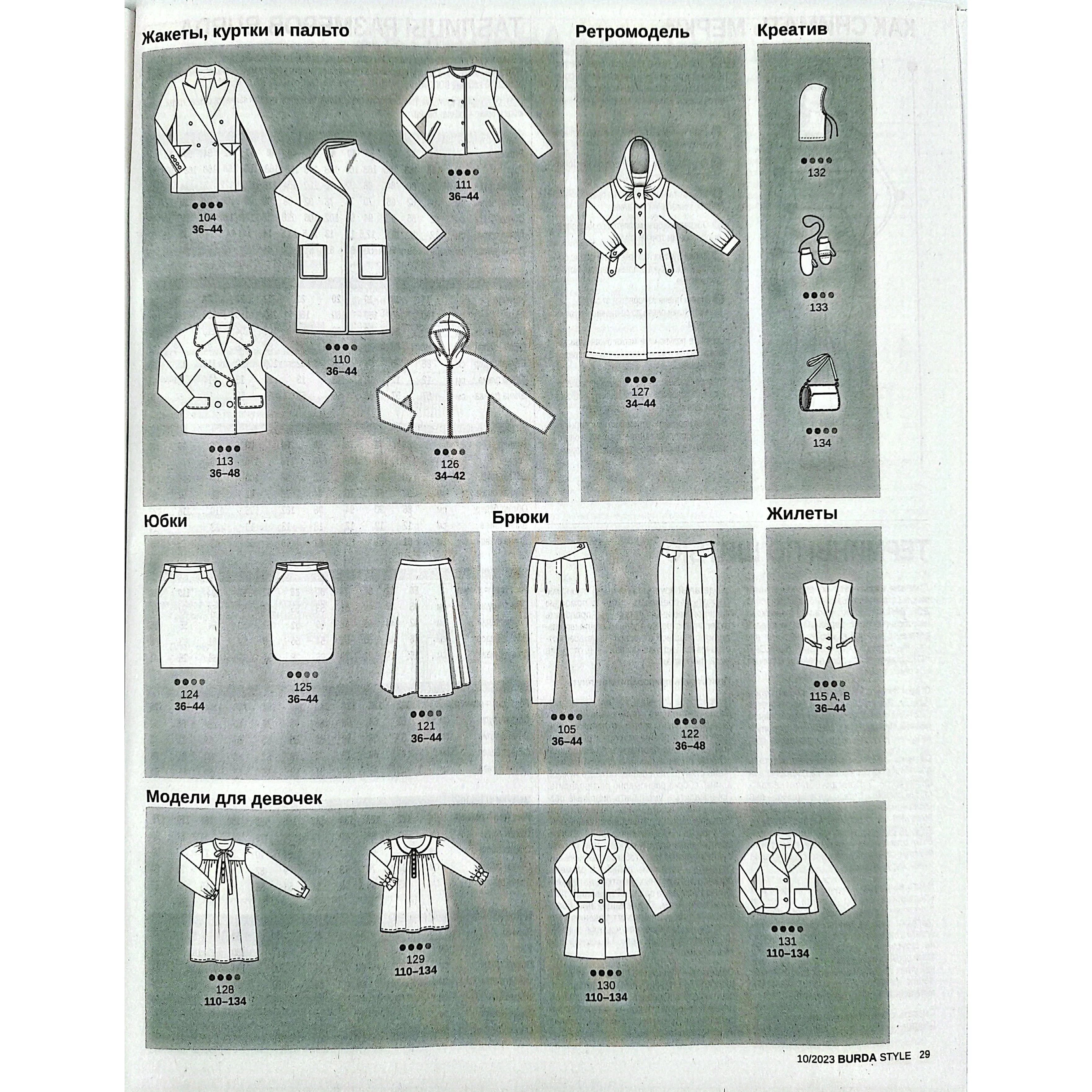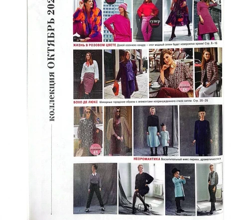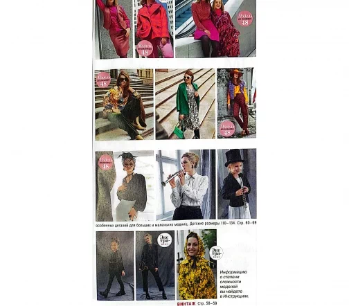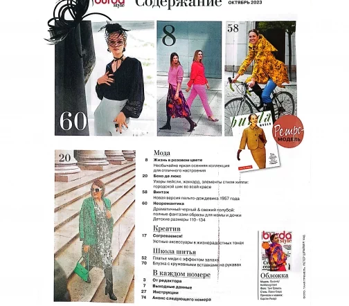 В новом выпуске: Розовый – новый чёрный! Поэтичные образы с лёгким налётом готики. Городская мода, пронизанная духом свободы стиля бохо. Ретро-дождевик для яркой осени вопреки капризам погоды. Жизнь в розовом цвете. Необычайно яркая осенняя коллекция для отличного настроения. Бохо де люкс. Узоры пейсли, жаккард, элементы стиля хиппи: городской шик во всей красе. Винтаж. Новая версия пальто-дождевика 1957 года. Неоромантика. Драматичный черный и свежий голубой: полные фантазии образы для мамы и дочки. Детские размеры 110–134. Креатив. Школа шитья. Платье миди с эффектом запаха.