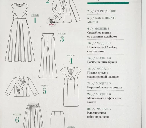 Свадебное платье со съемным шлейфом. Приталенный блейзер с карманами. Расклешенные брюки. Платье-футляр с драпировкой на лифе. Короткий жакет с розами. Макси-юбка с эффектом запаха. Классическая юбка-карандаш. Блузка с вырезом «качели». Платье-трансформер с завязками. Брюки с застроченными складками-стрелками. Платье-футляр с фигурным вырезом. Блузка с бантом из органзы. Жакет-болеро из дюшеса. Юбка силуэта «тюльпан». Атласное платье со сборками.
