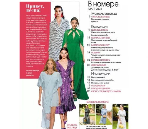 В номере: Модель месяца Carolina Herrera. Платье миди с мелким принтом. Коллекция. На каждый день. Стильные и практичные вещи базового гардероба. Натуральный шик. Женственные модели в бежевой гамме. Встречаем весну. Главные тенденции сезона в мини-коллекции городской моды. Подиум. Четыре платья от именитых мировых дизайнеров.