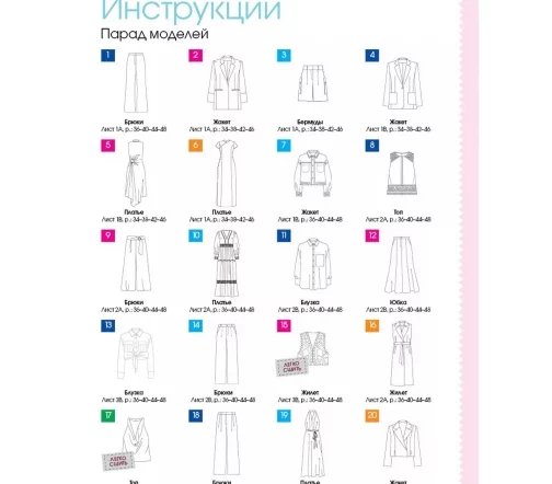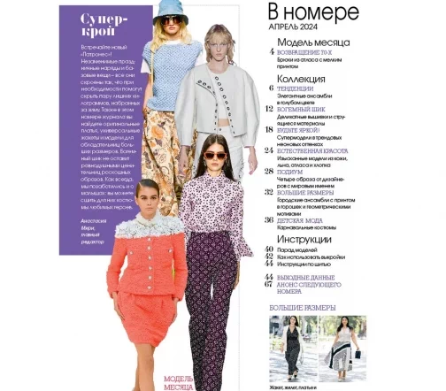 В каждом номере – около 40 женских моделей широкого размерного ряда, предназначенные для работы, праздничных выходов, отдыха и путешествий, а также модели для детей. Журнал содержит подробные инструкции по шитью и выкройки, обеспечивающие отличную посадку на фигуру.