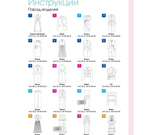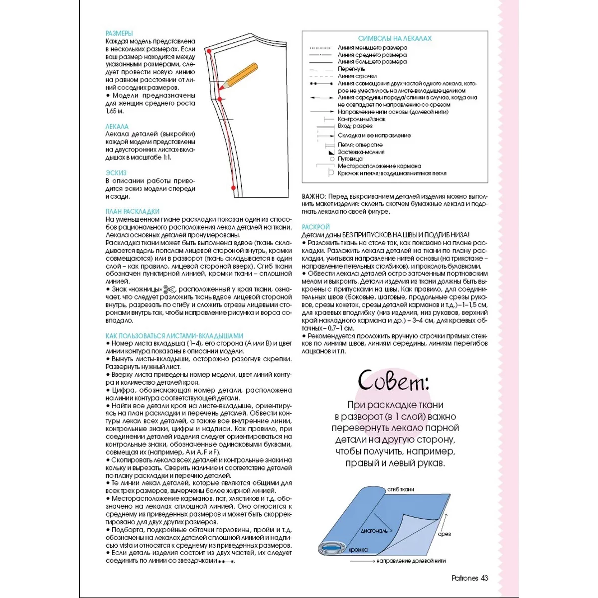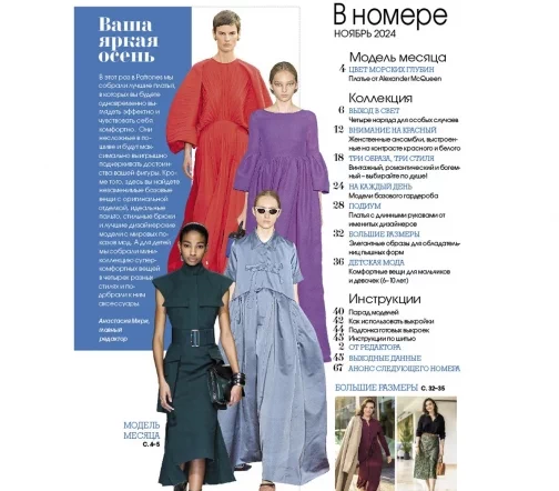 В каждом номере – около 40 женских моделей широкого размерного ряда, предназначенные для работы, праздничных выходов, отдыха и путешествий, а также модели для детей. Журнал содержит подробные инструкции по шитью и выкройки, обеспечивающие отличную посадку на фигуру.
