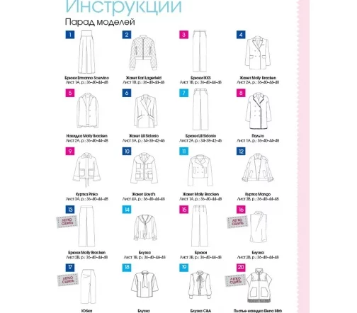 В каждом номере – около 40 женских моделей широкого размерного ряда, предназначенные для работы, праздничных выходов, отдыха и путешествий, а также модели для детей. Журнал содержит подробные инструкции по шитью и выкройки, обеспечивающие отличную посадку на фигуру.
