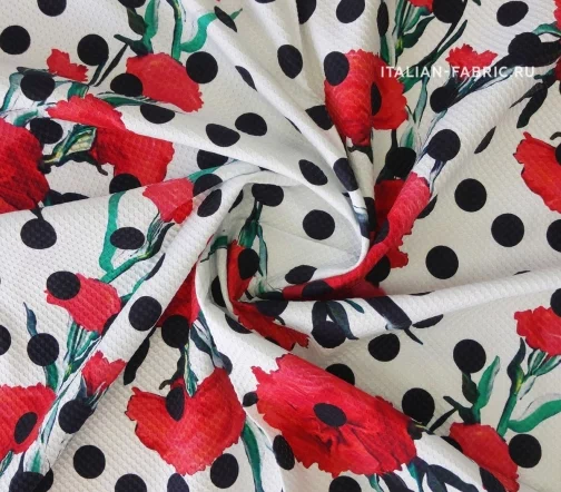 Основной фон белый, брендовый принт гвоздики и горохи.