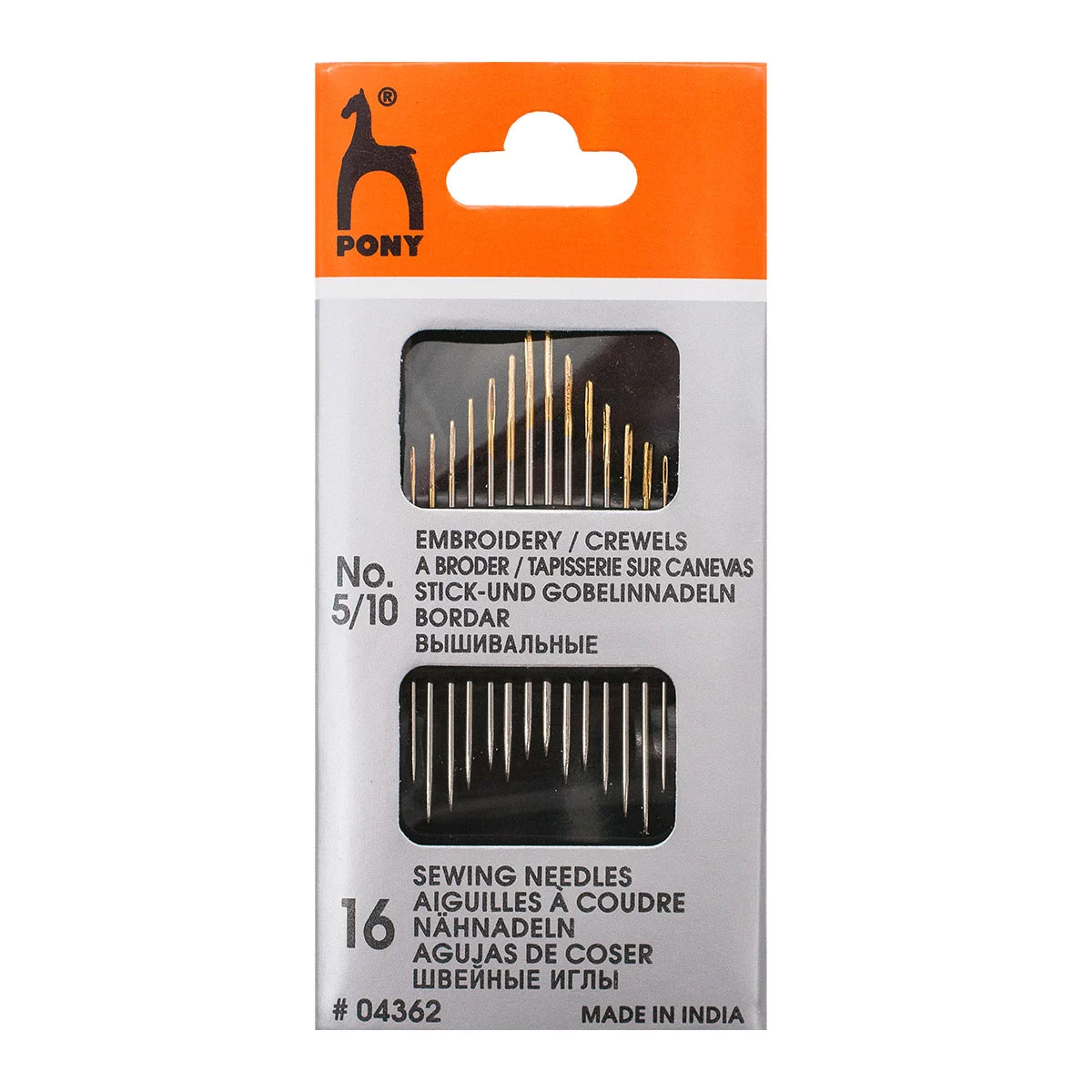 Набор Pony 'Embroidery/Crewels' включает в себя 16 стальных острых игл разных размеров. Набор предназначен для шитья, мелкого ремонта и вышивания в различных техниках. Благодаря гладкой поверхности, равномерной толщине и вытянутому ушку иглы идеально подходят для вышивания крестом или гобеленовым стежком. Ушко иглы позолочено, поэтому вдевать в него нить удобно даже при ослабленном зрении.