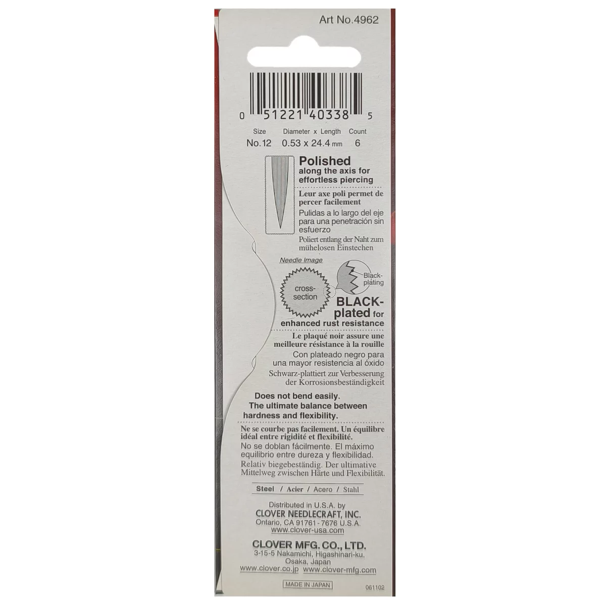 4962 Иглы черно-золотые для квилтинга средние, № 12, 6 шт., Clover