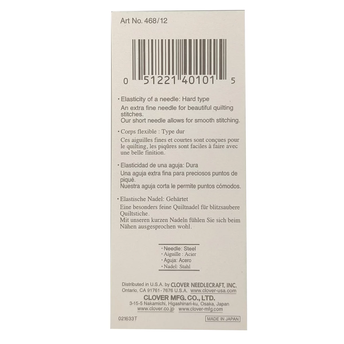 468/12 Иглы для квилтинга, № 12, 15 шт., Clover