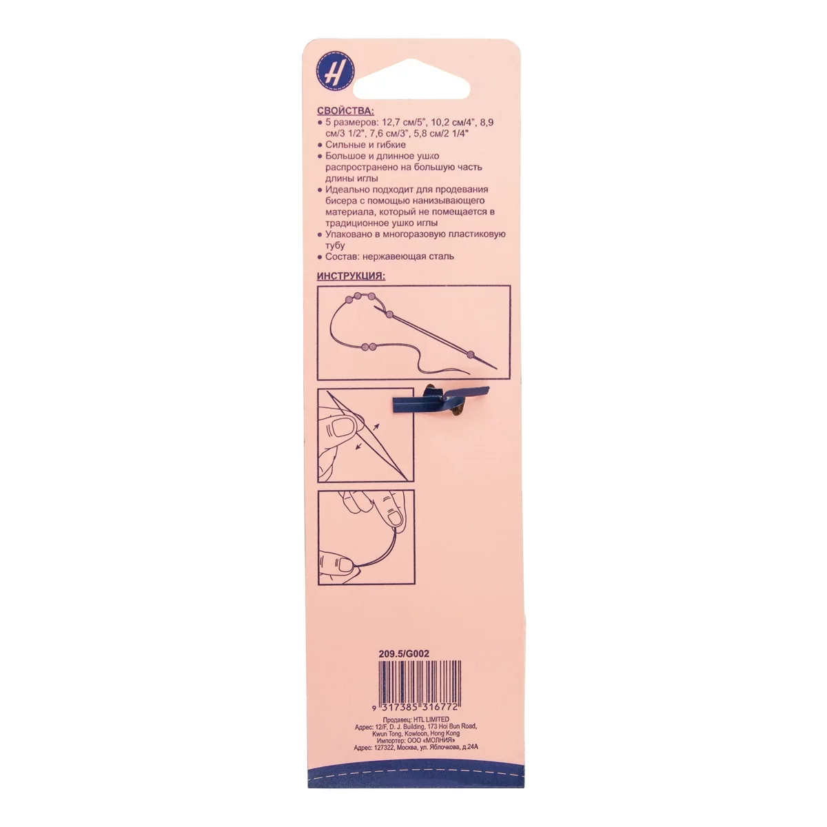 209.5 Иглы ручные для бисера с большим ушком в пластиковой тубе, сталь, 5 размеров, 10 шт., Hemline