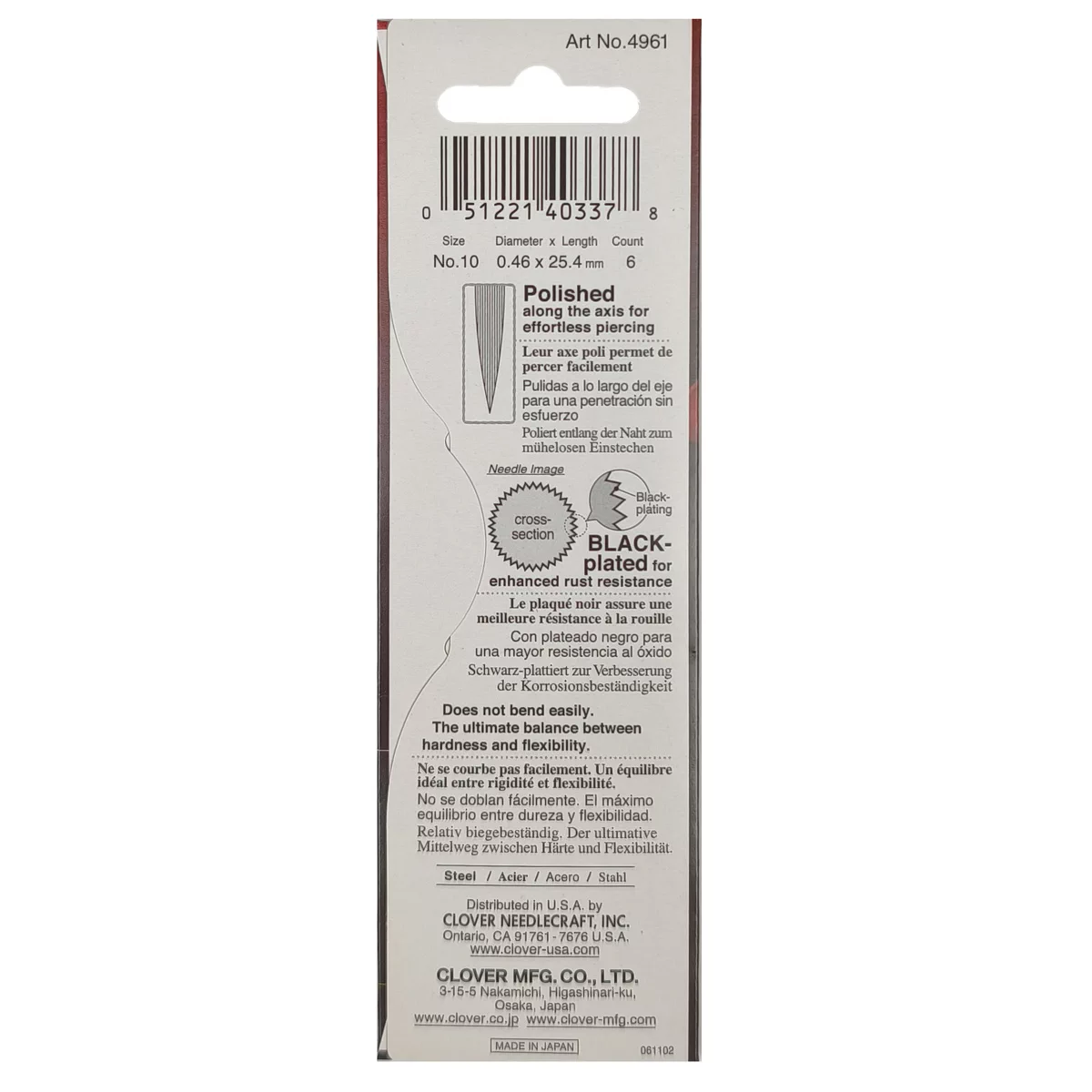 4961 Иглы черно-золотые для квилтинга средние, № 10, 6 шт., Clover