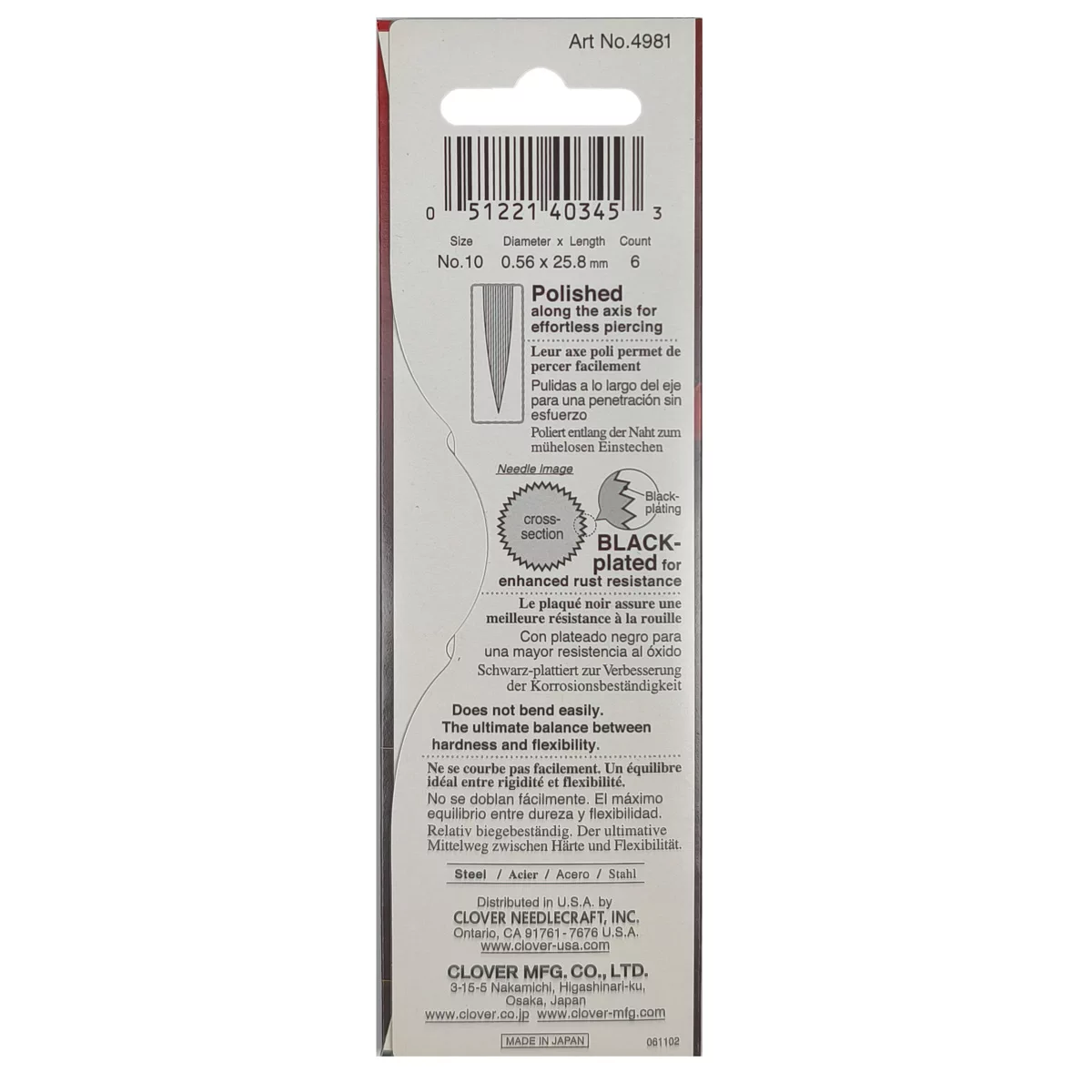 4981 Иглы черно-золотые для квилтинга, № 10, 6 шт., Clover