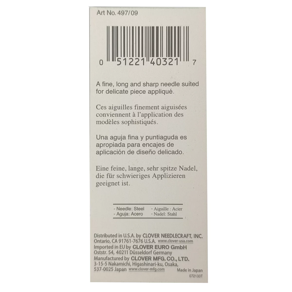 497/09 Иглы для аппликаций с позолоченной головкой, № 9, 34,9 мм, 15 шт., Clover