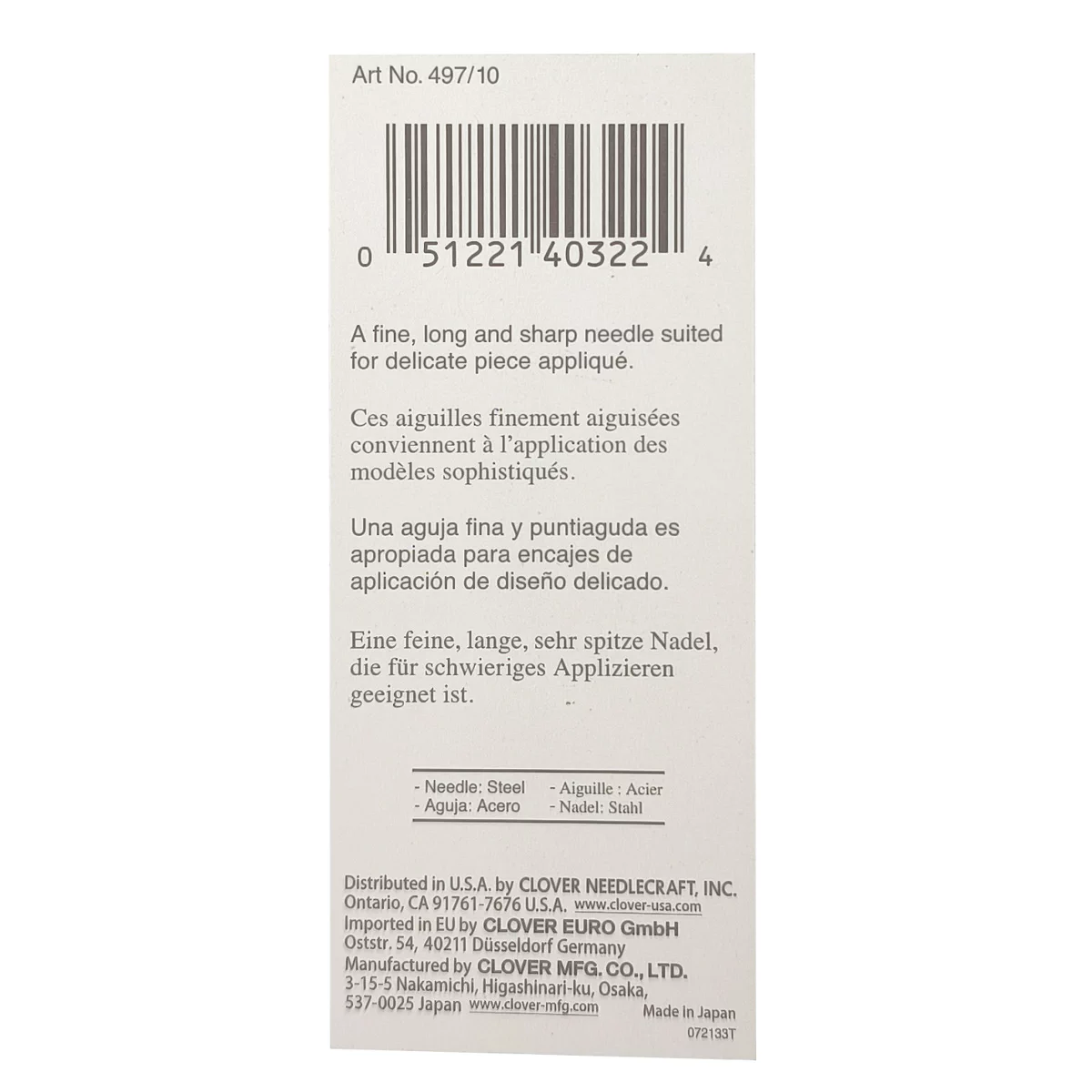 497/10 Иглы для аппликаций с позолоченной головкой, № 10, 33,3 мм, 15 шт., Clover