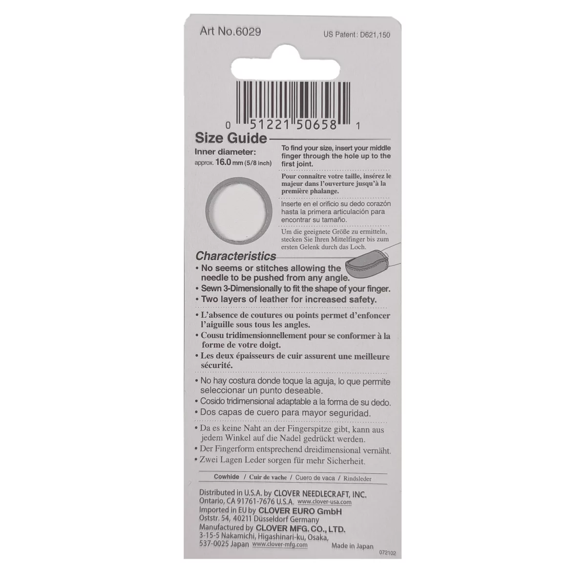 6029 Наперсток из натуральной кожи, размер M, 16 мм, Clover