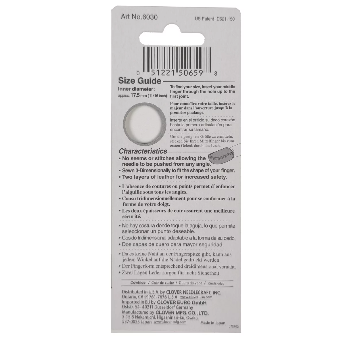 6030 Наперсток из натуральной кожи, размер L, 17,5 мм, Clover