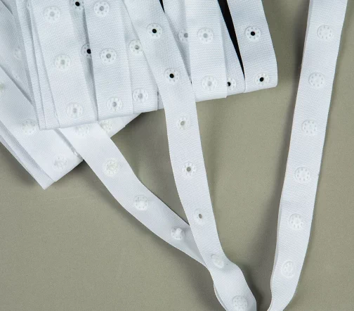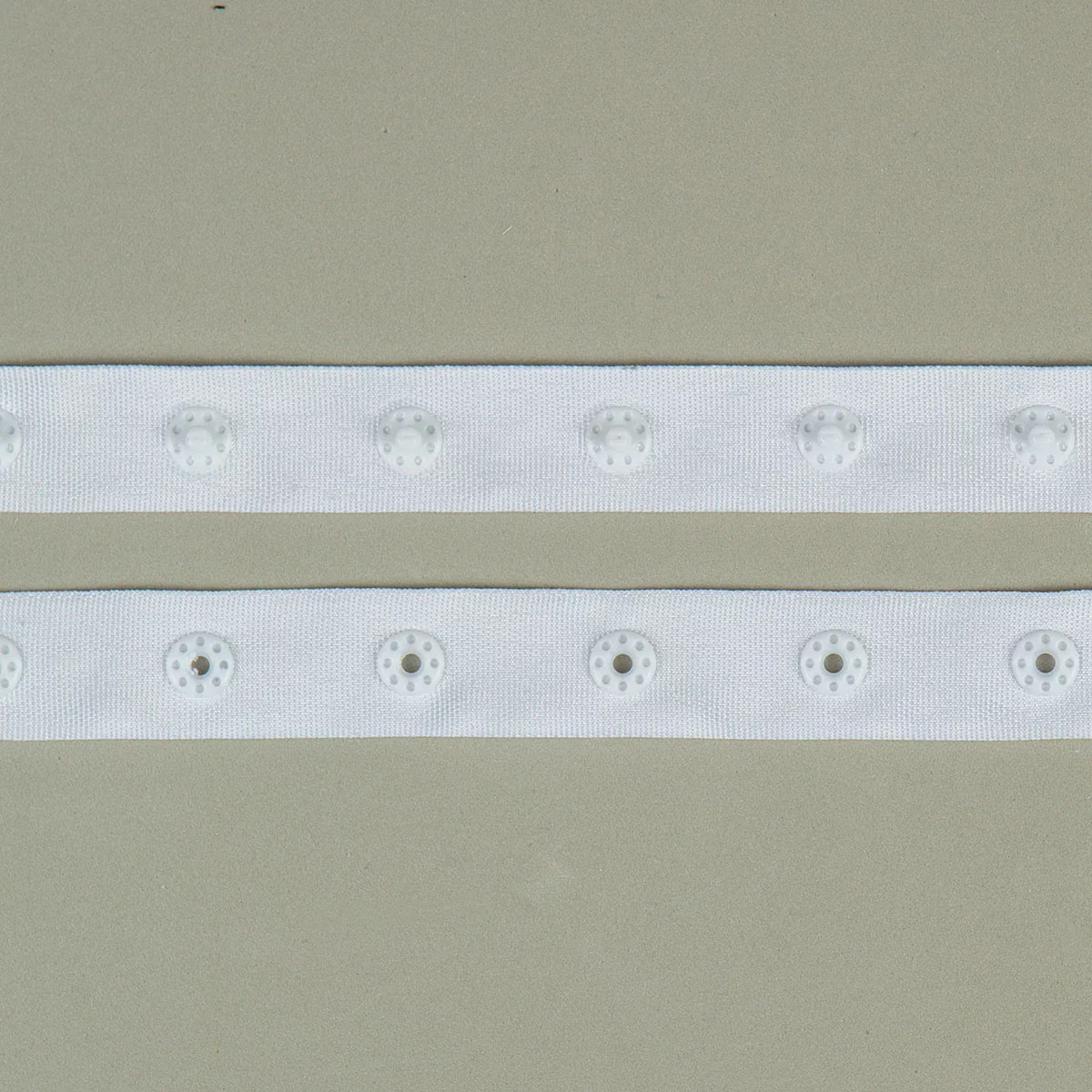 Такая застежка притачивается к изделию, комплект состоит из двух частей. Ширину ленты 18мм, диаметр пластиковой кнопки 8мм, 1 метр застежки имеет 40 кнопок, расстояние между кнопками 16мм, цвет белый. Состав-100% полиэстер.