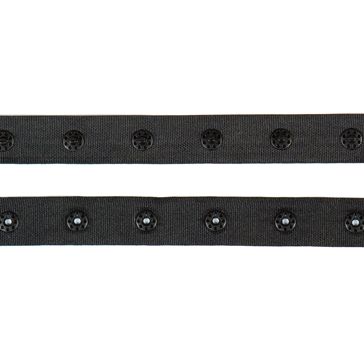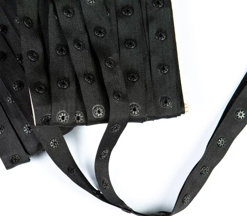 Такая застежка притачивается к изделию, комплект состоит из двух частей. Ширину ленты 18мм, диаметр пластиковой кнопки 8мм, 1 метр застежки имеет 40 кнопок, расстояние между кнопками 16мм, цвет черный. Состав-100% полиэстер.