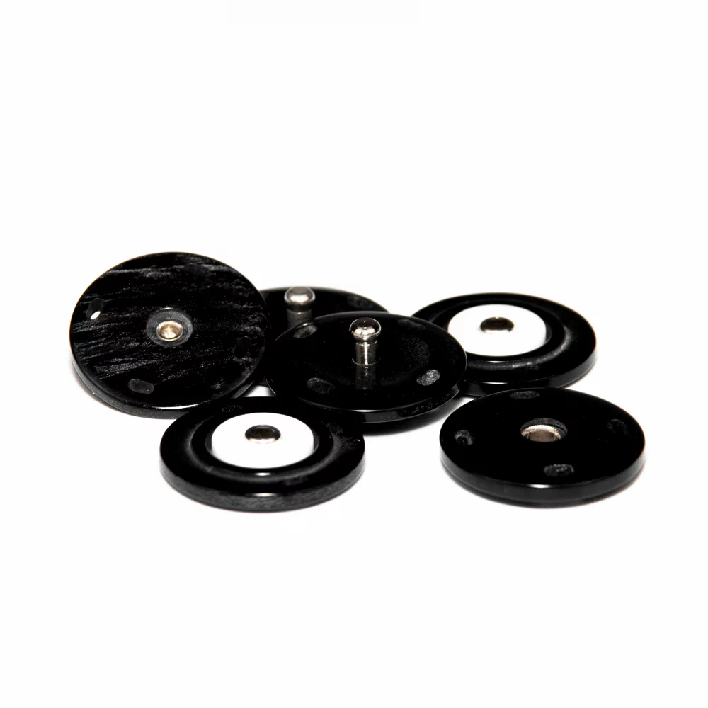 Минималистичные непришивные кнопки-застежки без украшений, гладкие, полусферической формы. Материал – сталь, тип контакта – 'пружина'. Диаметр кнопки 15 мм. Качество изготовления гарантирует прочное соединение и удобство застегивания/расстегивания кнопок. Фурнитура такого дизайна подойдет для одежды самых разнообразных стилей – от провокационного молодежного стрит-стайла и стиля рок до строгой элегантной классики и нежного бохо.
