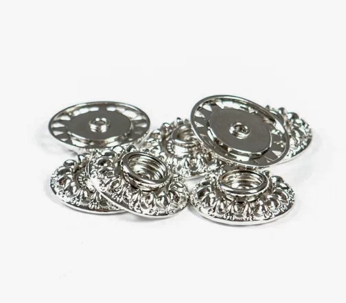 Металлические пришивные кнопки с гальваническим покрытием и не подвержены коррозии. Преимущество пришивной кнопки состоит в том, что для ее установки на изделие не надо иметь специального оборудования. Диапазон использования пришивной кнопки достаточно широк: от изготовления одежды до оформления интерьера. Пришивные кнопки выполнены достаточно декоративно, по краю имеют отверстия для иглы.