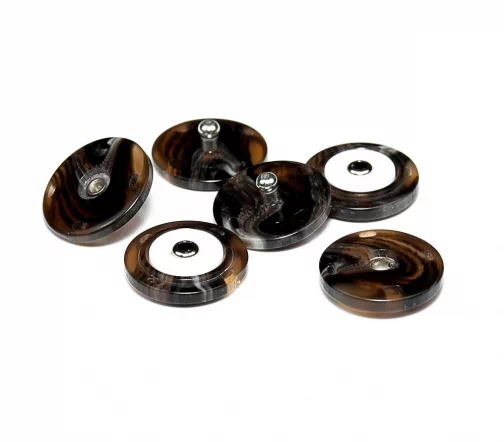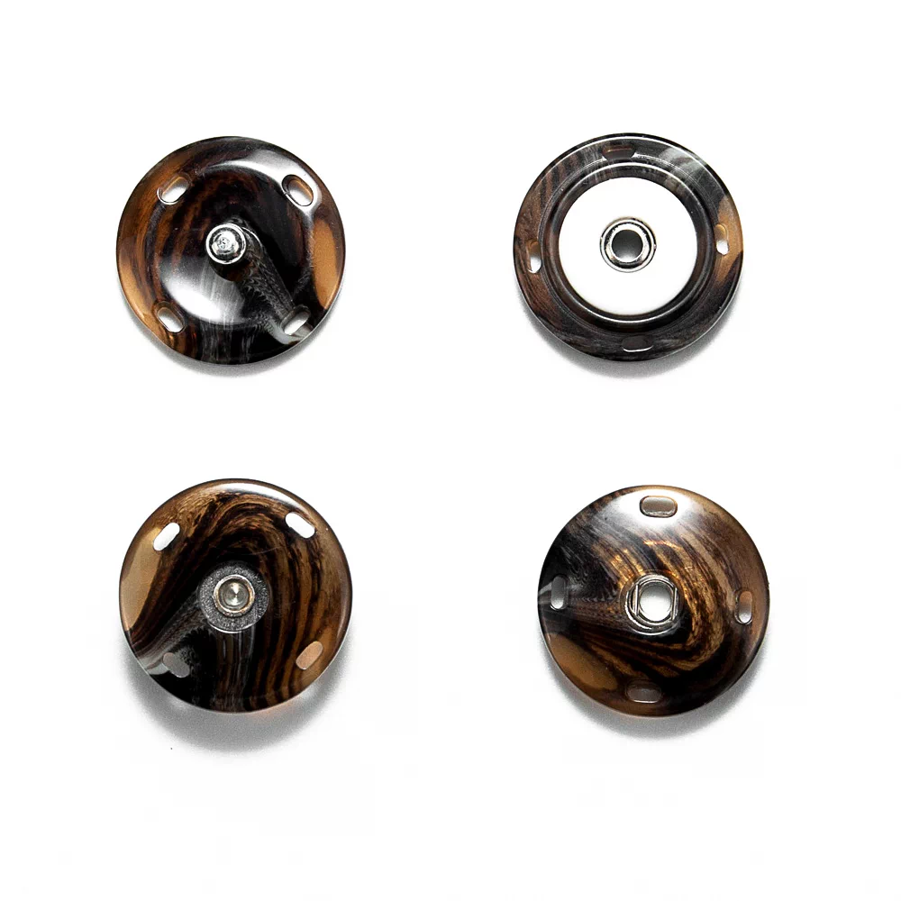 Пришивная пластковая кнопка из двух плоских частей с металлической вставкой. Покрытие полуглянцевое с неоднородным прокрасом в коричневых оттенках "под рог". Минималистичный дизайн и удобство в использовании позволят применить ее в самых разнообразных проектах и изделиях, прежде всего для обработки застежки верхних изделий.