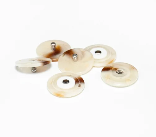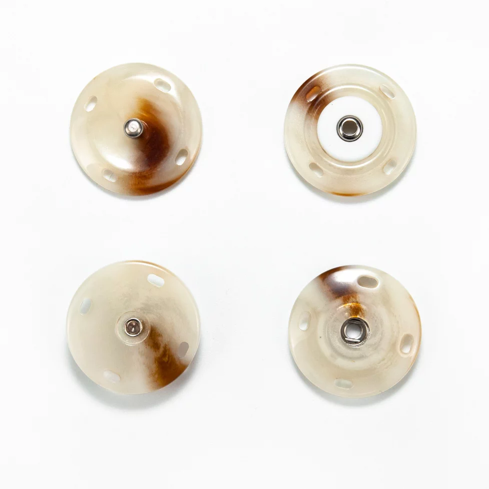 Пришивная пластковая кнопка из двух плоских частей с металлической вставкой. Покрытие полуглянцевое с неоднородным прокрасом в бежево-коричневых оттенках "под рог". Минималистичный дизайн и удобство в использовании позволят применить ее в самых разнообразных проектах и изделиях, прежде всего для обработки застежки верхних изделий.