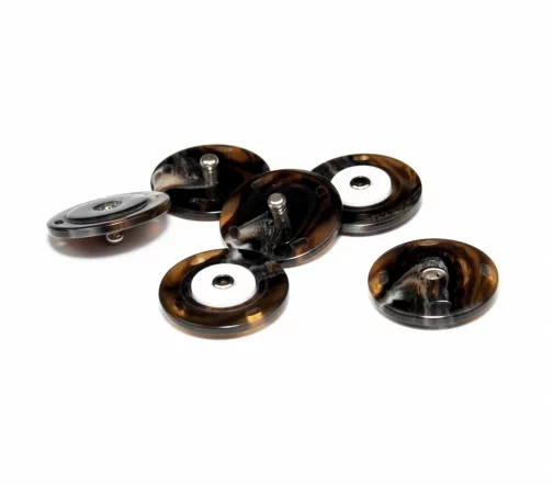 Пришивная пластковая кнопка из двух плоских частей с металлической вставкой. Покрытие полуглянцевое с неоднородным прокрасом в коричневых оттенках "под рог". Минималистичный дизайн и удобство в использовании позволят применить ее в самых разнообразных проектах и изделиях, прежде всего для обработки застежки верхних изделий.