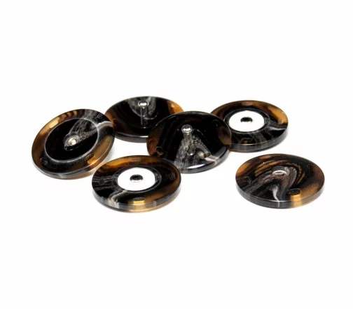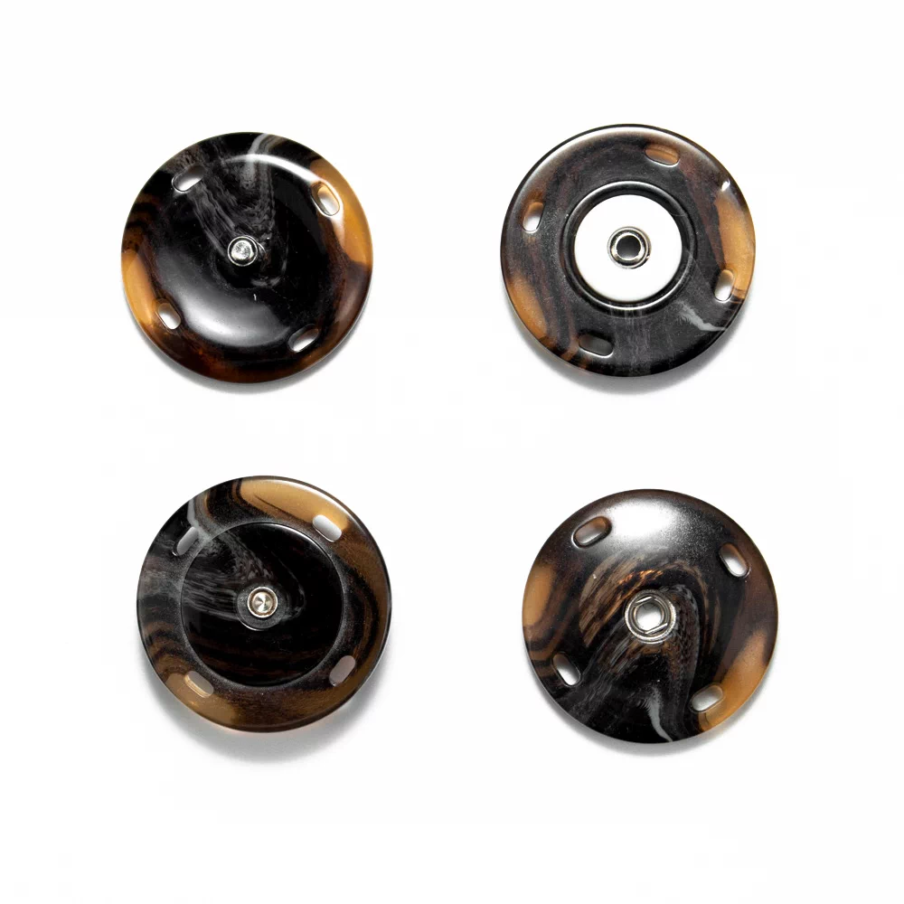 Пришивная пластковая кнопка из двух плоских частей с металлической вставкой. Покрытие полуглянцевое с неоднородным прокрасом в коричневых оттенках "под рог". Минималистичный дизайн и удобство в использовании позволят применить ее в самых разнообразных проектах и изделиях, прежде всего для обработки застежки верхних изделий.