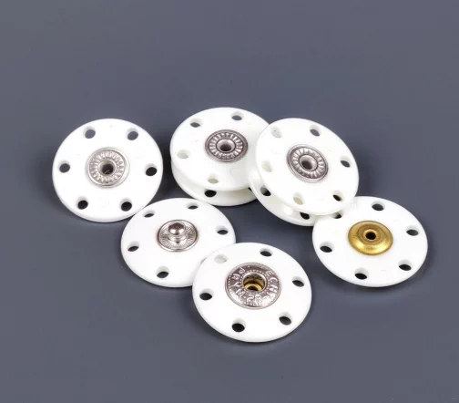 Пришивная пластиковая кнопка из двух плоских частей с металлической вставкой. Минималистичный дизайн и удобство в использовании позволят применить ее в самых разнообразных проектах и изделиях, прежде всего для обработки застежки верхних изделий.