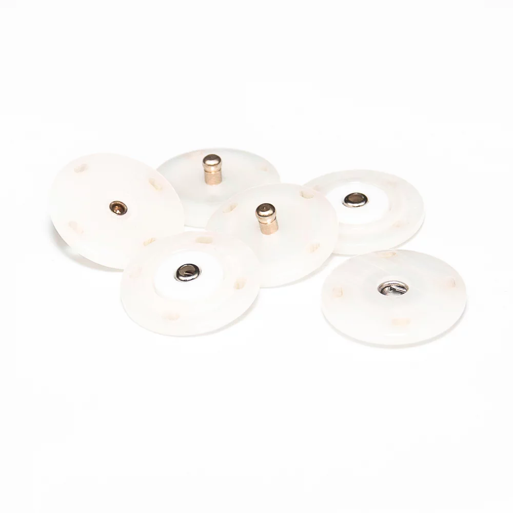 Пришивная пластиковая кнопка из двух плоских частей с металлической вставкой. Минималистичный дизайн и удобство в использовании позволят применить ее в самых разнообразных проектах и изделиях, прежде всего для обработки застежки верхних изделий.
