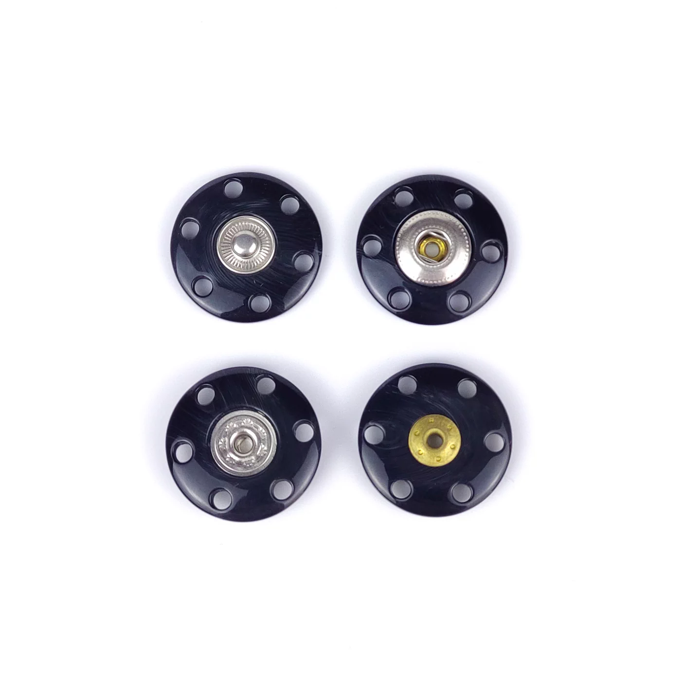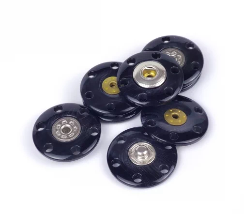 Пришивная пластиковая кнопка из двух плоских частей с металлической вставкой. Покрытие полуглянцевое с переливом. Минималистичный дизайн и удобство в использовании позволят применить ее в самых разнообразных проектах и изделиях, прежде всего для обработки застежки верхних изделий.