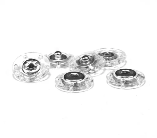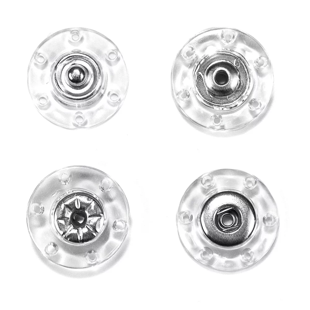Пришивные кнопки-застежки круглой формы с обкладкой из прозрачного пластика. Диаметр 18 мм, цвет металлической части – серый металлик. Минималистичный дизайн и удобство в использовании этой фурнитурной детали позволят применить ее в самых разнообразных проектах и изделиях, а мягкая обкладка гарантирует прочность крепления.