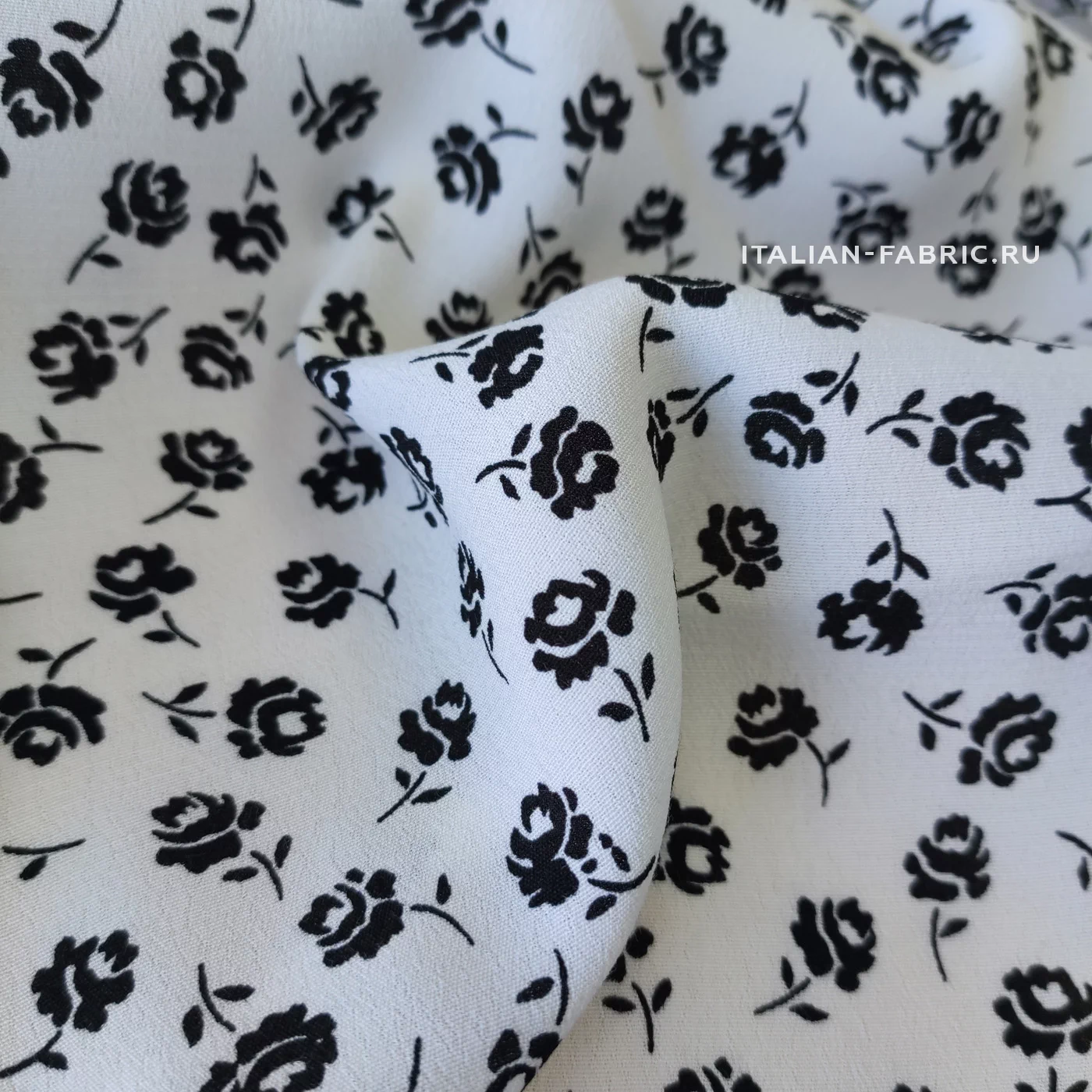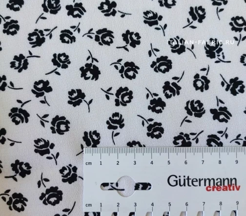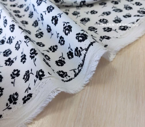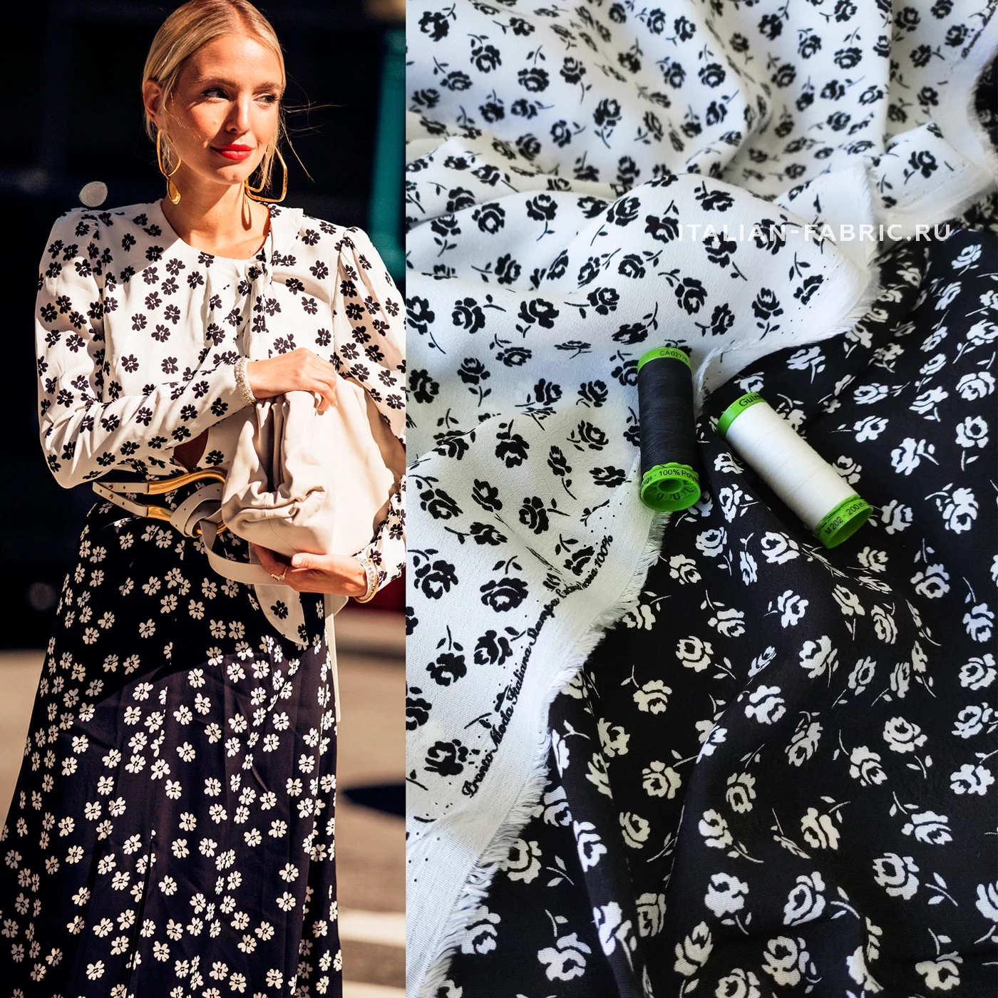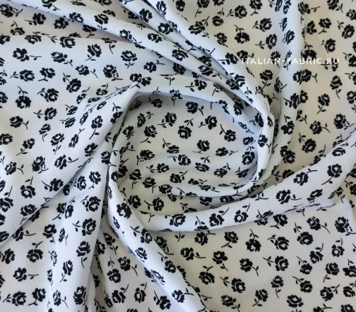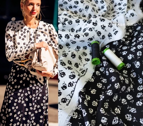 Материал средней плотности, ближе к тонкому; мягкий и приятный на ощупь. Креп с мелким цветочным принтом в двух расцветках. Эти ткани самодостаточны по отдельности в любых изделиях – блузках, юбках, платьях, а также очень красиво сочетаются вместе, как это демонстрирует streetstyle-модель. Две расцветки – белый фон с черными цветочками, черный фон с белыми цветочками.