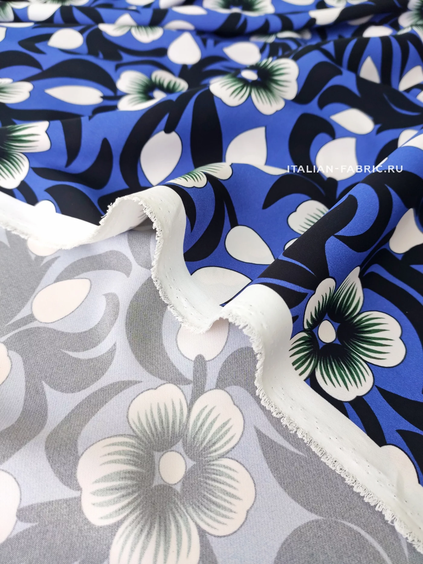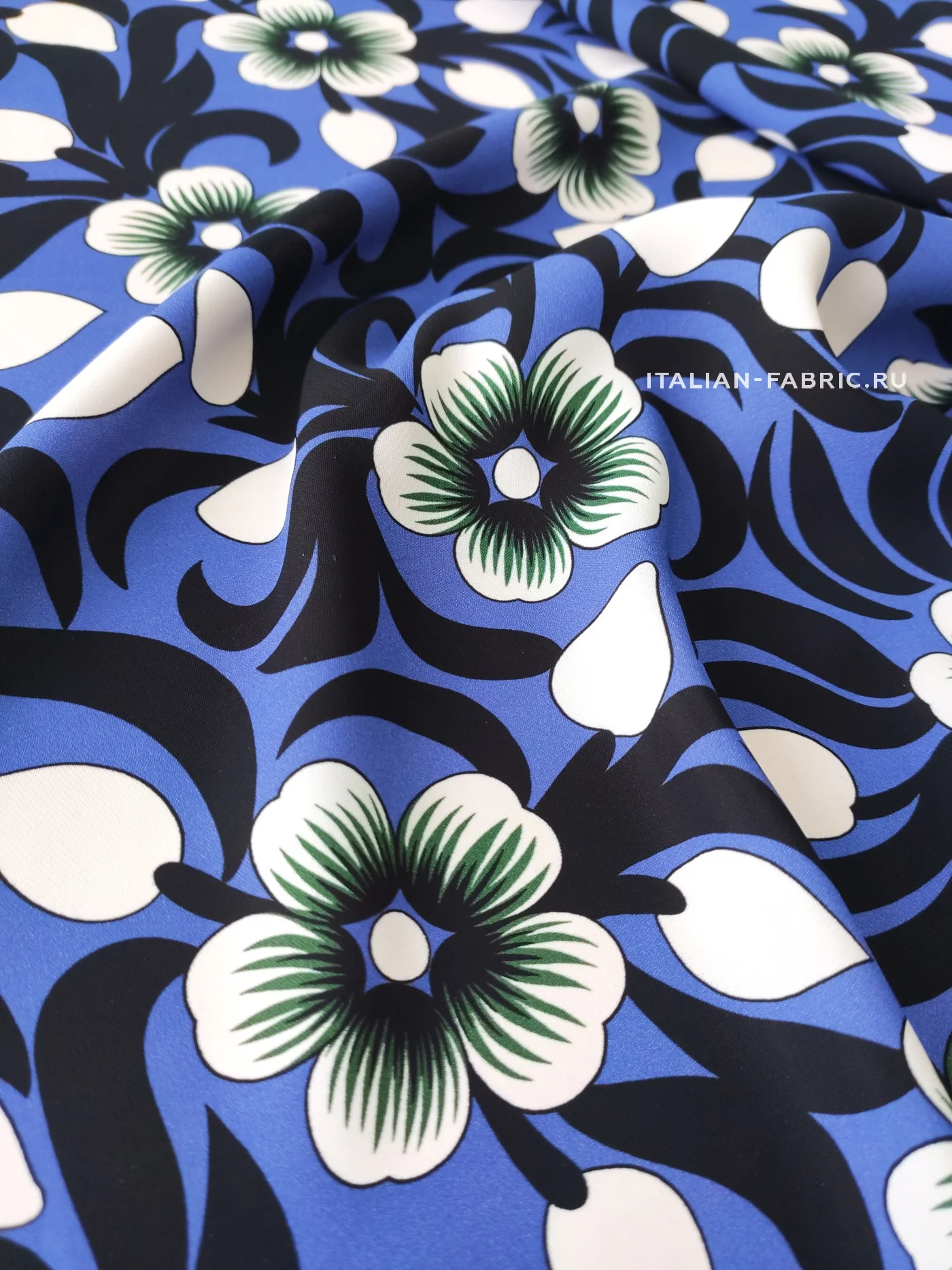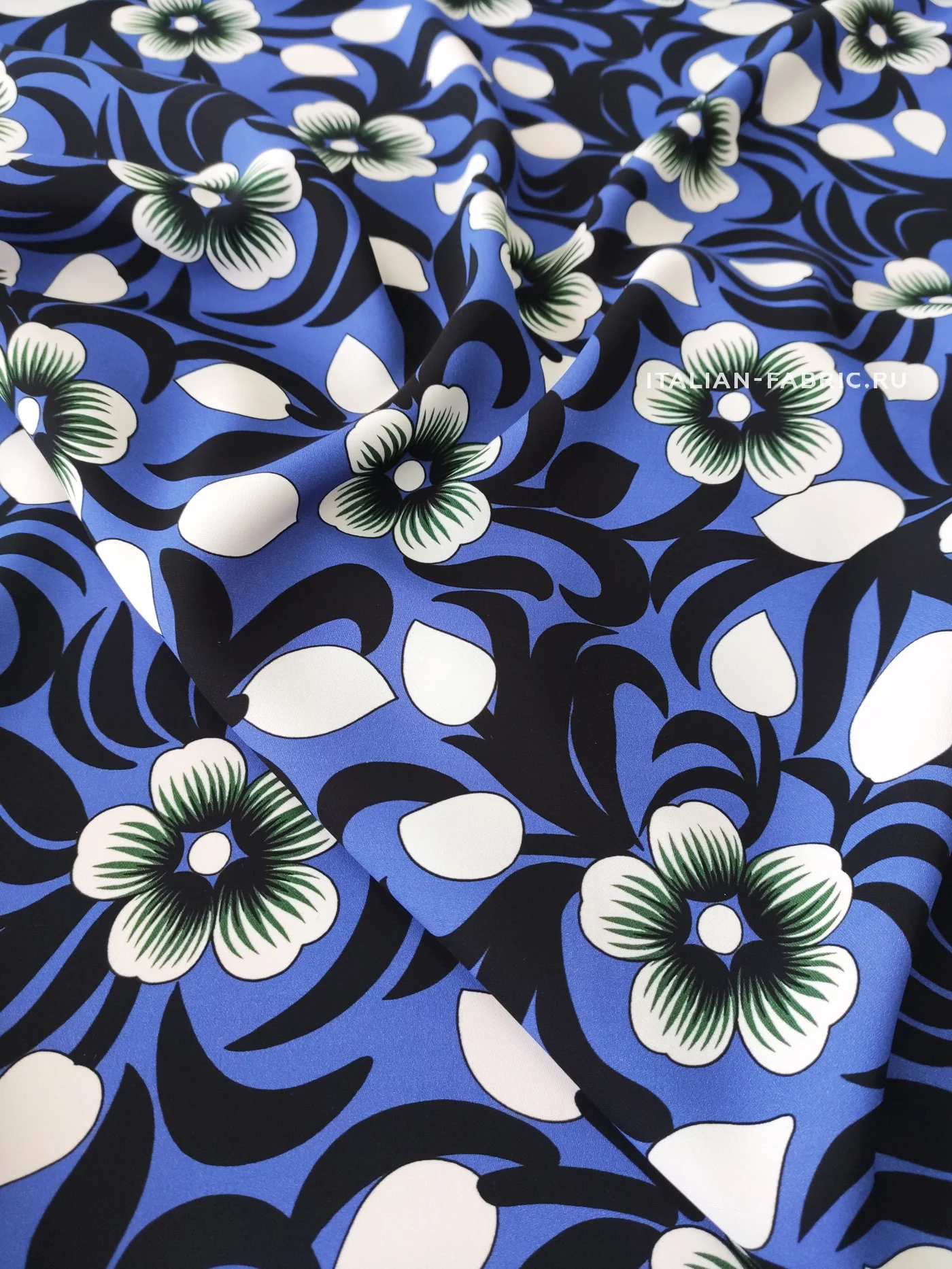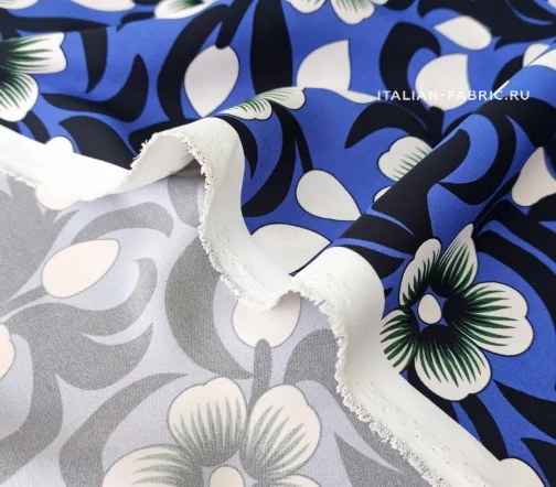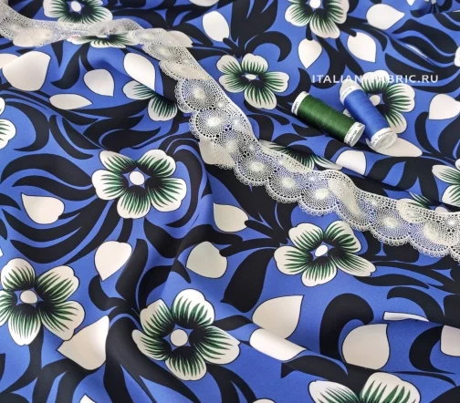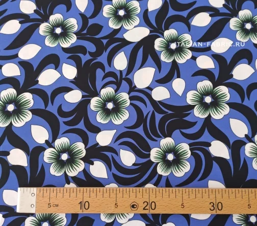 Креп с графичными цветами на роскошной красоты лазурно-синем фоне. Размер цветка – 6 х 6 см. Материал гладкий, плотный, красиво драпируется, приятный тактильно. Креп очаровательно смотрится в платьях, блузках, топах, туниках, юбках, брюках.