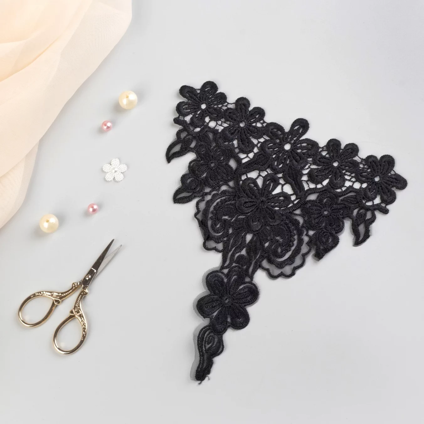 Прекрасно сочетается с нарядными тканями – фатином, атласом, тонким бархатом, крепом. Кружевную аппликацию можно дополнить бисером, стразами, бусинами в тон.