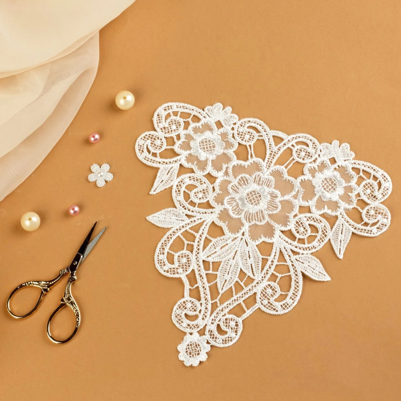 Прекрасно сочетается с нарядными тканями – фатином, атласом, тонким бархатом, крепом. Кружевную аппликацию можно дополнить бисером, стразами, бусинами в тон.