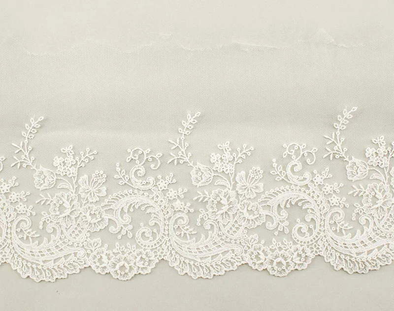 Вышивка выполнена матовыми полиэстеровыми нитями №110. Тюль-основа из 100% полиэстера имеет запас на растяжимость, не дает стягивания швов, края не осыпаются. Применяется для отделки свадебных и нарядных женских платьев. Также применяется для отделки женских платьев, юбок и жакетов из легких и средней плотности тканей, например сукна и габардина; великолепно подходит для отделки женского белья и одежды из трикотажа; изысканно смотрится как отделка вязаных изделий. Кружево на тюле мягкое, удобно в носке и легкое в уходе, не мнется. Стирать в режиме деликатной стирки, сушить в расправленном виде, гладить с изнаночной стороны в 1 или 2 температурном режиме.