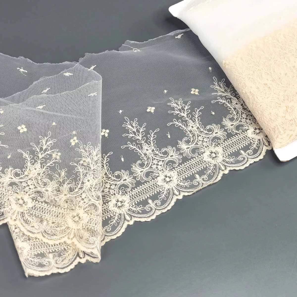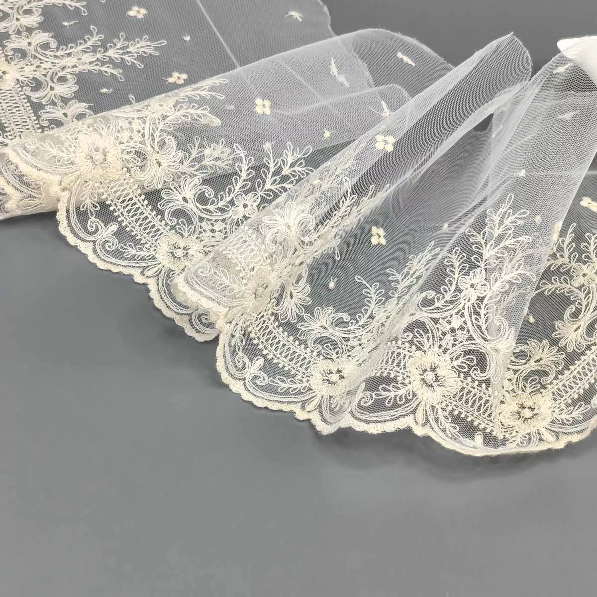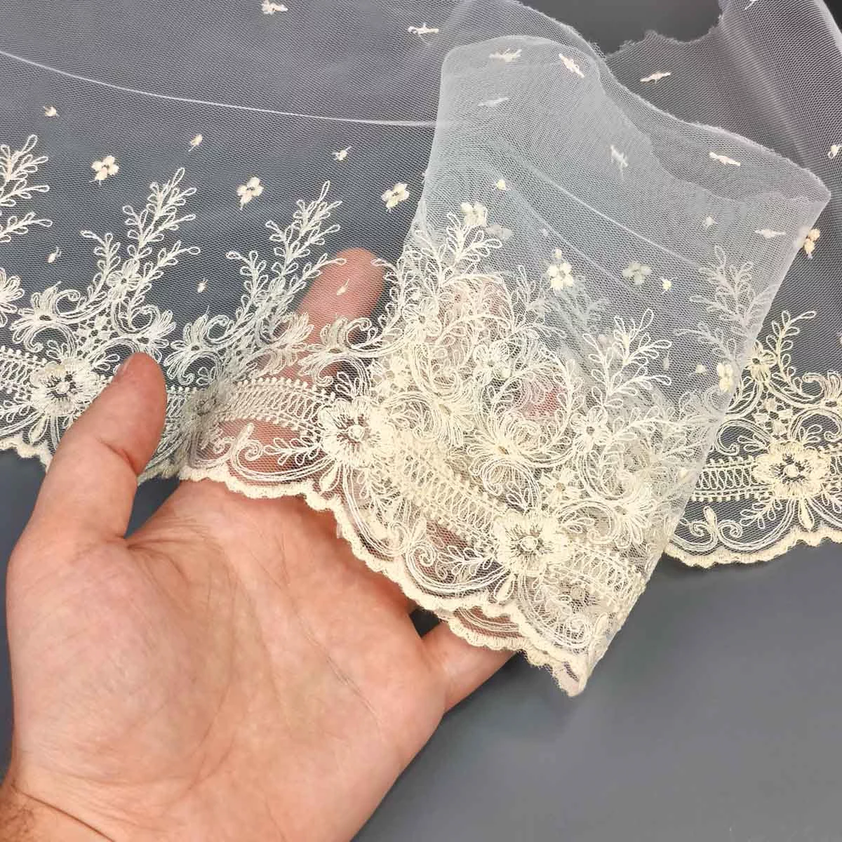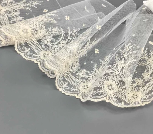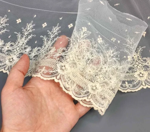 Вышивка выполнена матовыми полиэстеровыми нитями №110. Тюль-основа из 100% полиэстера имеет запас на растяжимость, не дает стягивания швов, края не осыпаются. Применяется для отделки свадебных и нарядных женских платьев. Также применяется для отделки женских платьев, юбок и жакетов из легких и средней плотности тканей, например сукна и габардина; великолепно подходит для отделки женского белья и одежды из трикотажа; изысканно смотрится как отделка вязаных изделий. Кружево на тюле мягкое, удобно в носке и легкое в уходе, не мнется. Стирать в режиме деликатной стирки, сушить в расправленном виде, гладить с изнаночной стороны на 1 или 2 температурном режиме.
